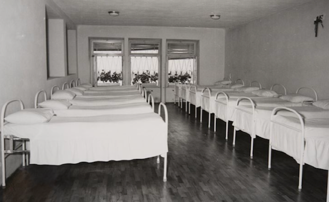 Schlafsaal in der Landwirtschaftlichen Siedlung für ruhige Geisteskranke Stadlhof bei Pfatten, 2. Hälfte 20. Jahrhundert. Südtiroler Landesarchiv