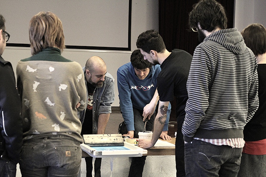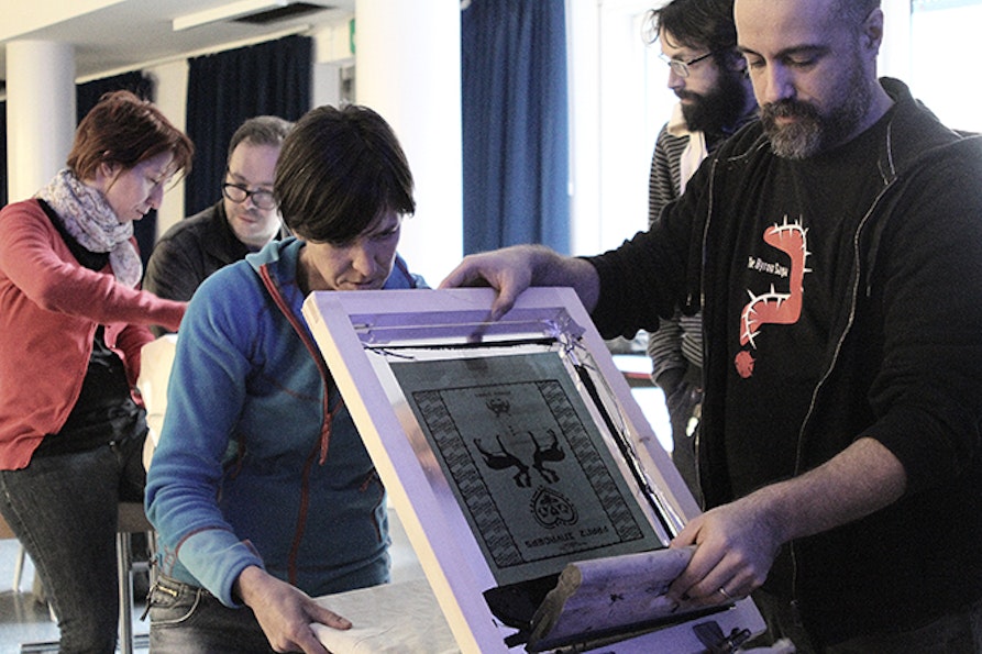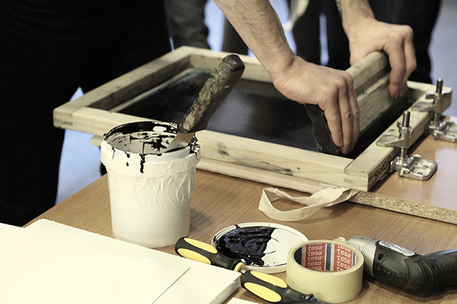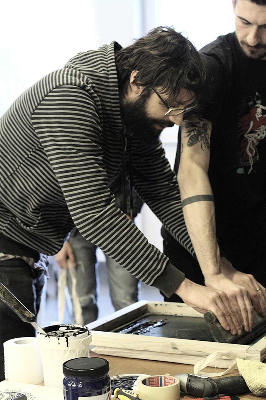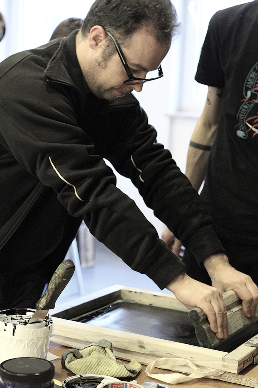 Das war der Siebdruck-Workshop mit den großartigen Oscar Odd Diodoro + Andrea Baldelli + Fabio Meschini, Mitte März 2014. Was die aufmerksamen Schülerinnen und Schüler gelernt haben, seht ihr auf den Fotos… Und ausserdem seht ihr noch: Den Schöpfer der neuen Tasche für franz, Felix Lalù, beim Bewundern seines Werkes. – Die Tasche wird übrigens in Bälde in allen Shops eures Vertrauens zu erstehen sein…