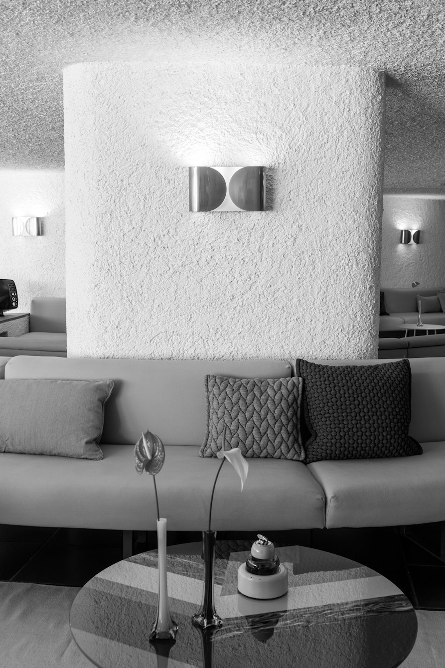 Lasciamo per un attimo la parabola esterna – coi sui volumi possenti ed equilibrati, l’alternanza perfetta tra rientranze e protuberanze, la muratura immacolata solidamente ancorata ai confini dell’acqua – per veleggiare finalmente dentro a questo straordinario Hotel du lac d’altri tempi e dei nostri tempi.