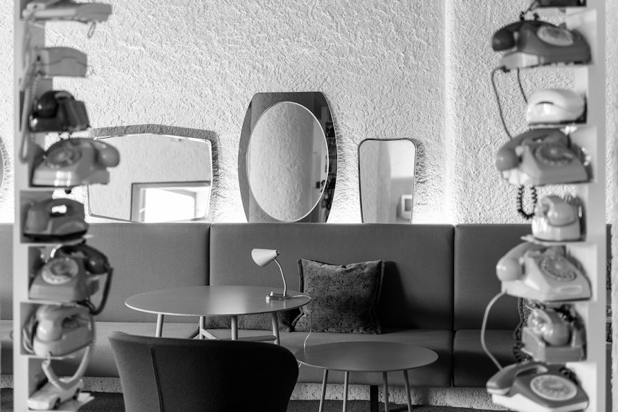 Telefoni e televisori di quando eravamo bambini, poltrone e divani curvilinei che si arrotolano intorno a imponenti colonne, la scia di luce delle lampade a terra e a muro degne di un museo del design, le tante forme panciute o longilinee dei vasi di fiori, macchine da scrivere dal segno indimenticato per siglare il diario di bordo, tavoli, tavolini e altre superfici su cui lasciar scorrere occhi e mani… Lo spirito della collezionista che ha composto questa meraviglia dialoga con eloquenza con lo spirito del collezionista che la scopre per la prima o la centesima volta. E la sincronia tra pieni e vuoti, tra grande architettura e piccoli oggetti, tra bianco lineare ed esplosioni di colore, è un piacere così intenso, appagante e intrigante che non possiamo far altro che tuffarci. Non nel lago – lo faremo poi – ma in questo coinvolgente approdo tra passato e bellezza.