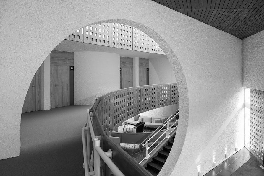 Lo stupore continua a guidare lo sguardo, che non sa dove attraccare mentre cerca – di virata in virata – di cogliere ogni particolare, senza però perdere il senso sacrale eppure piacevolmente informale dell’insieme. La profonda scalinata invita a salire verso l’inseguirsi di linee della volta infinita aperta sul legno e sul cielo. Seguendo il percorso tattile tra parapetti traforati, la parete slanciata o le ridondanze ondulate che intervallano il perimetro dei corridoi, raggiungiamo il nostro nido privato affacciato sul lago.