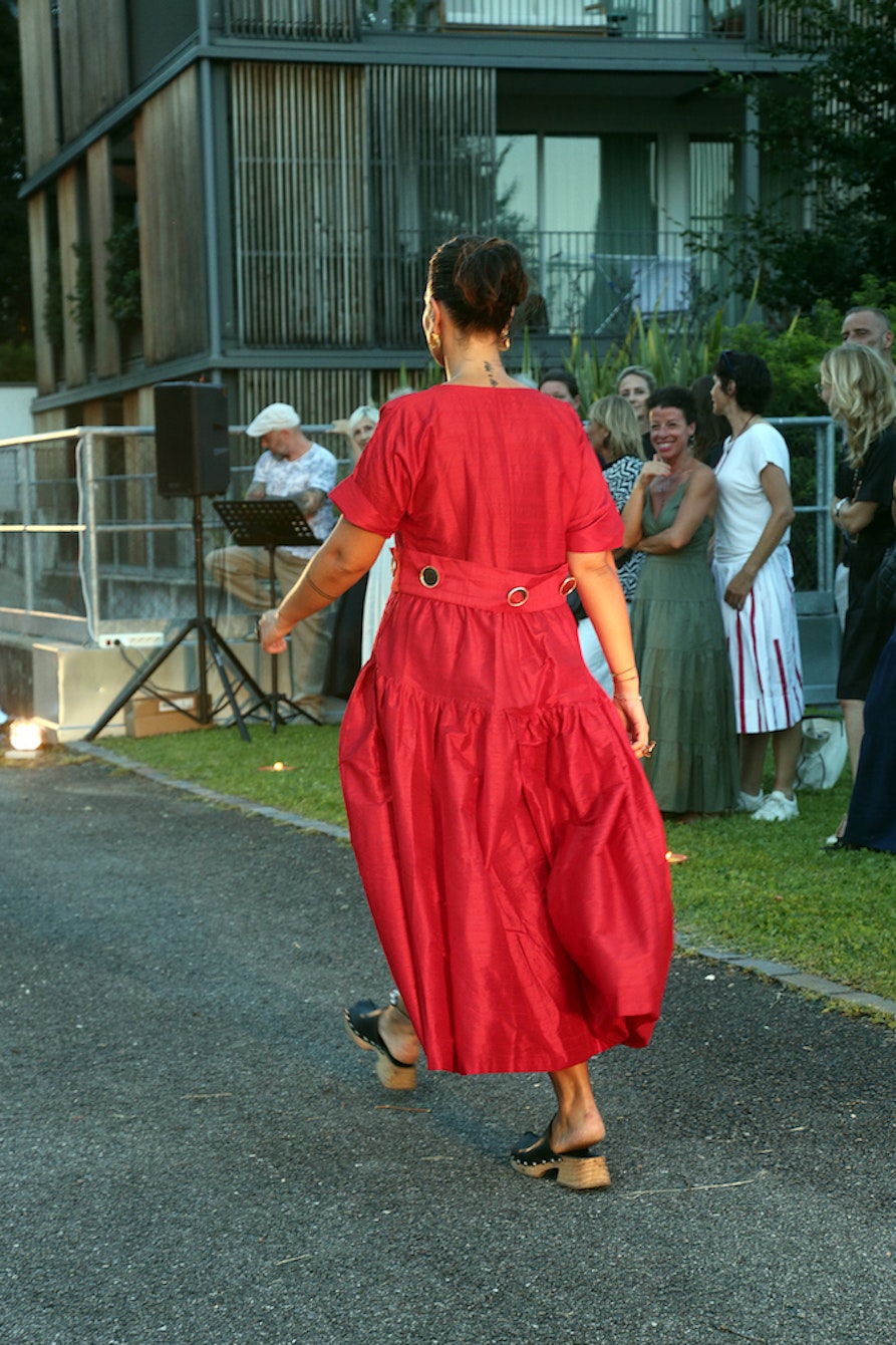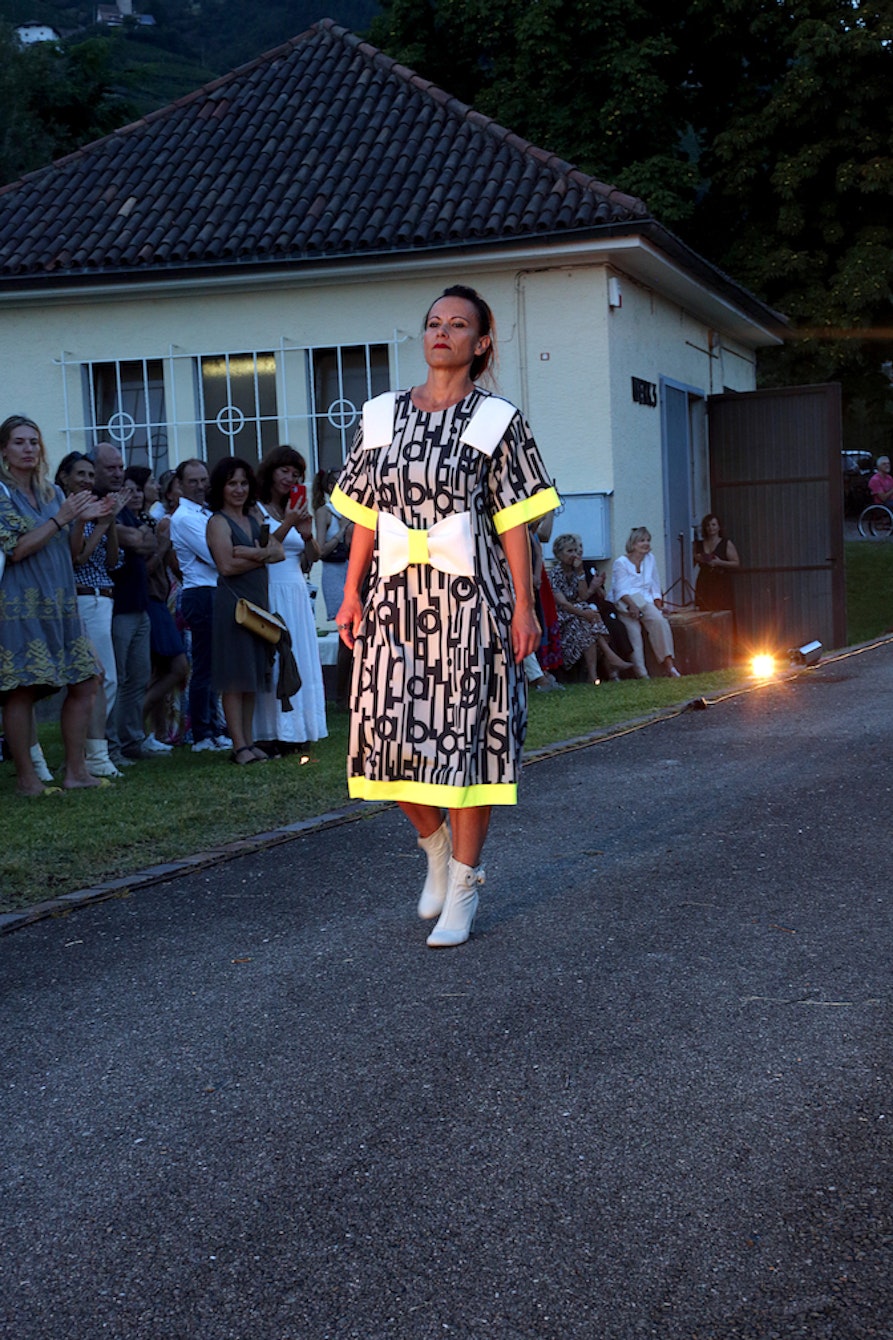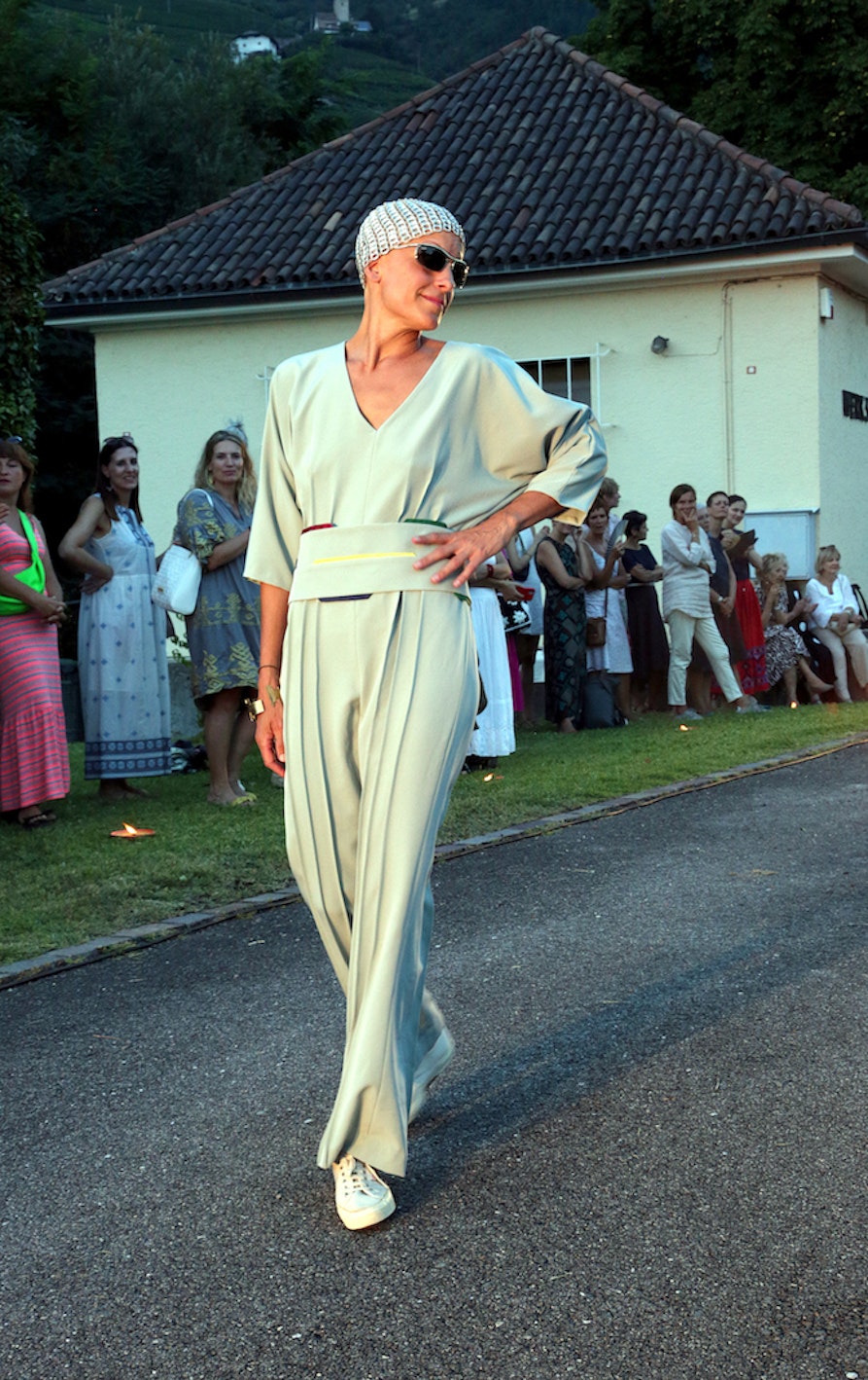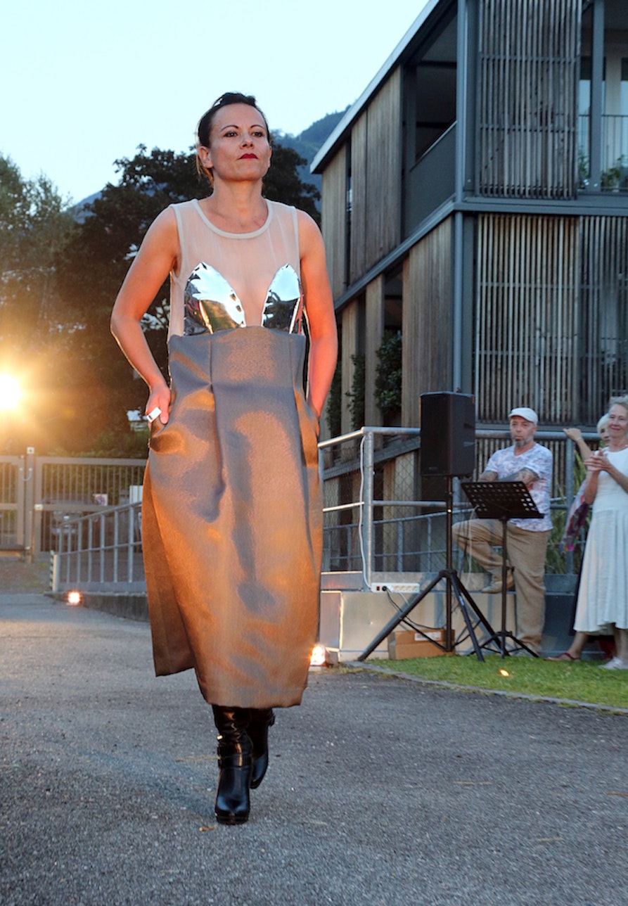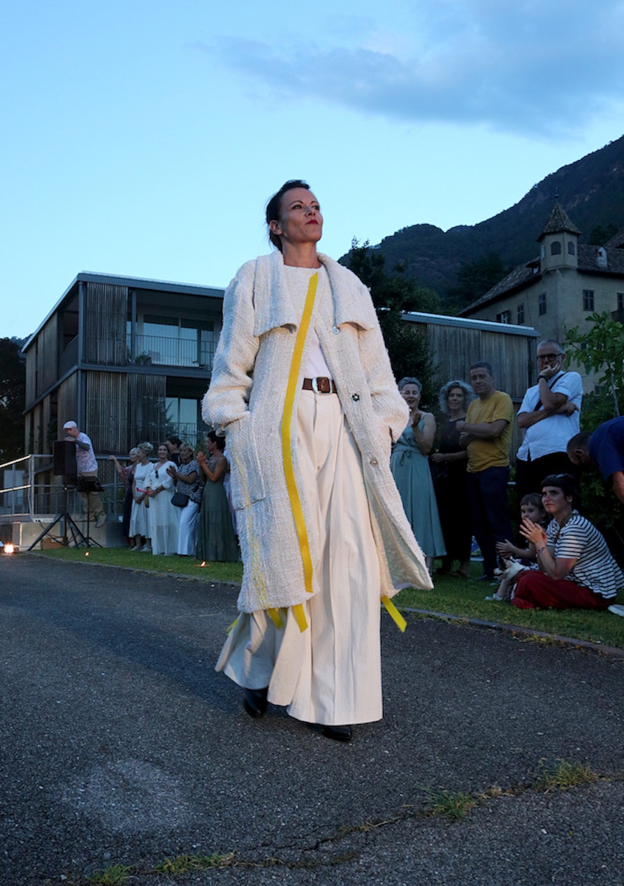 Da Mode immer auch visuell erfahrbar sein sollte, gab es dazu eine Fashion Show. Im November 2022 zeigte die in Bozen lebende bulgarische Designerin Violeta Nevenova im Kraftwerk Rendelstein eine Auswahl ihrer Arbeit: alles Einzelstücke, handgefertigt aus Reststoffen. Eine andere Jahreszeit, neue Entwürfe – wir entschieden uns dazu, dass Violeta auch diesen Abend mit ihren Designs bespielen sollte. Diesmal fand die Fashion Show draußen statt, vor der alten, stillgelegten Kraftanlage Rendelstain. Wir hatten Glück mit dem Wetter, die Hitze war erträglich und wir haben einen wunderschönen Abend miteinander verbracht.