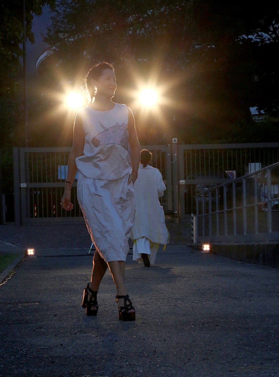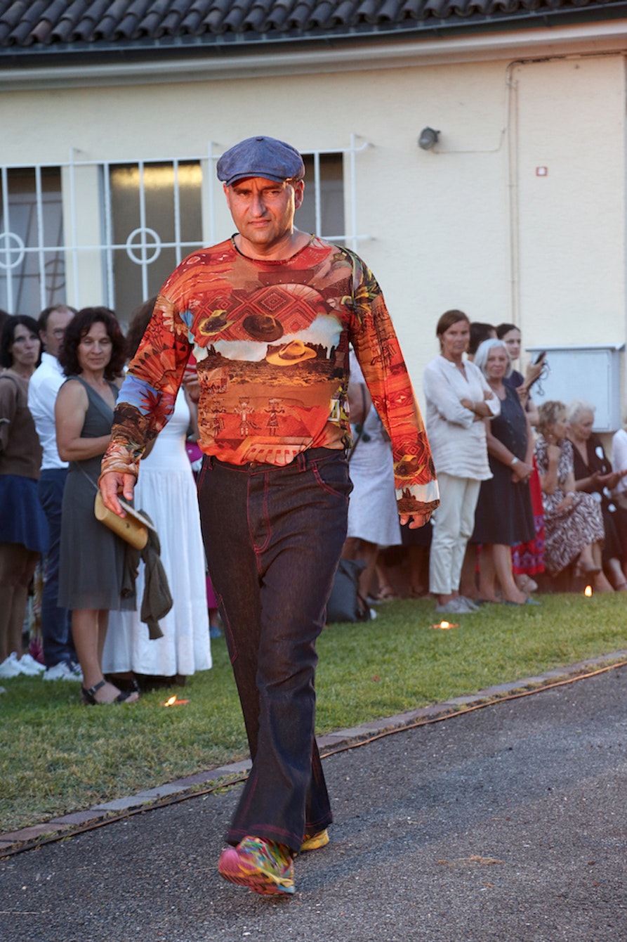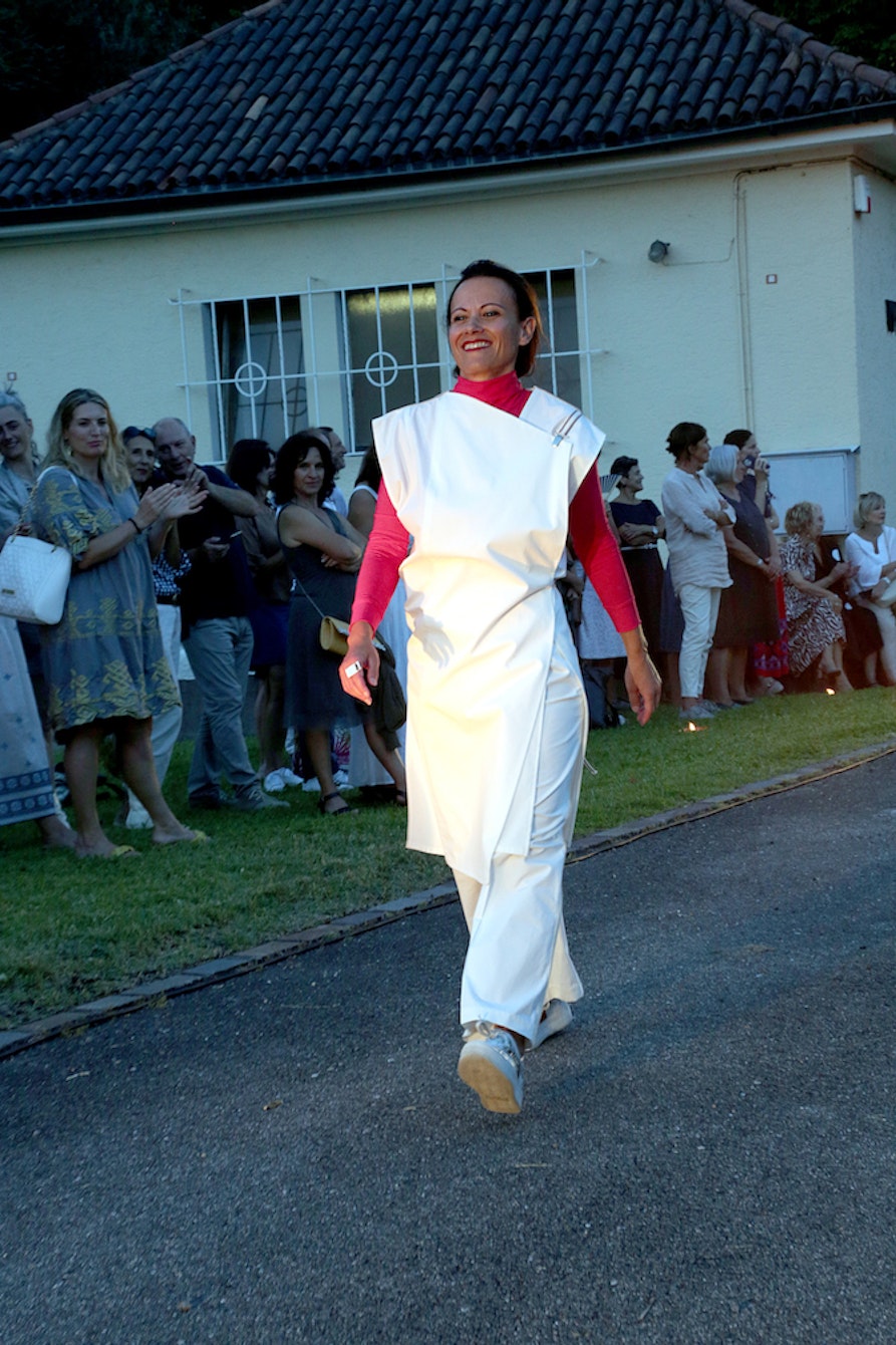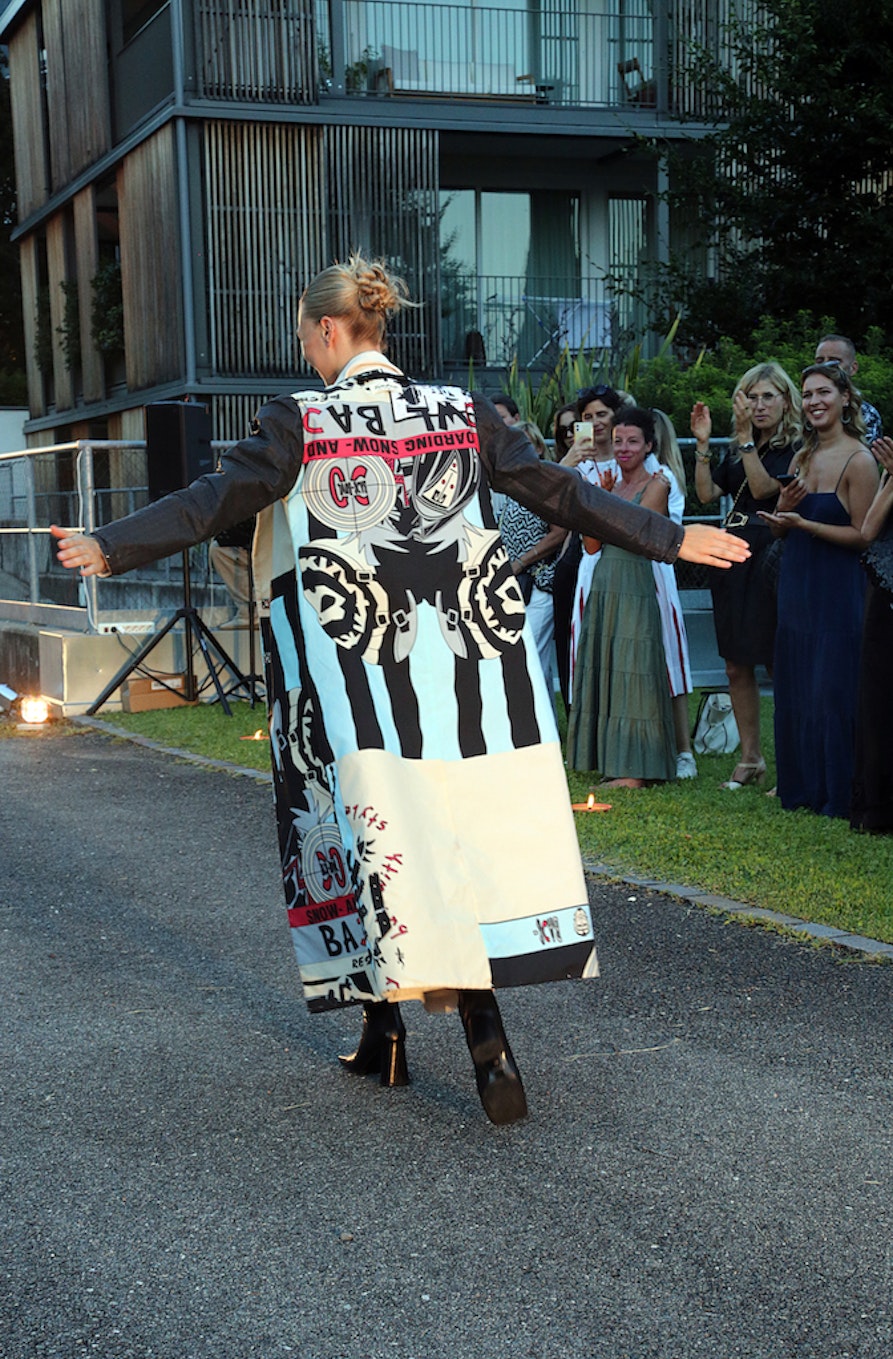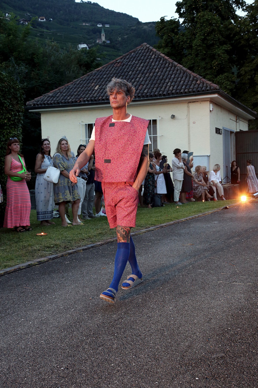 Da Mode immer auch visuell erfahrbar sein sollte, gab es dazu eine Fashion Show. Im November 2022 zeigte die in Bozen lebende bulgarische Designerin Violeta Nevenova im Kraftwerk Rendelstein eine Auswahl ihrer Arbeit: alles Einzelstücke, handgefertigt aus Reststoffen. Eine andere Jahreszeit, neue Entwürfe – wir entschieden uns dazu, dass Violeta auch diesen Abend mit ihren Designs bespielen sollte. Diesmal fand die Fashion Show draußen statt, vor der alten, stillgelegten Kraftanlage Rendelstain. Wir hatten Glück mit dem Wetter, die Hitze war erträglich und wir haben einen wunderschönen Abend miteinander verbracht.