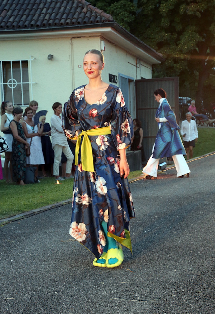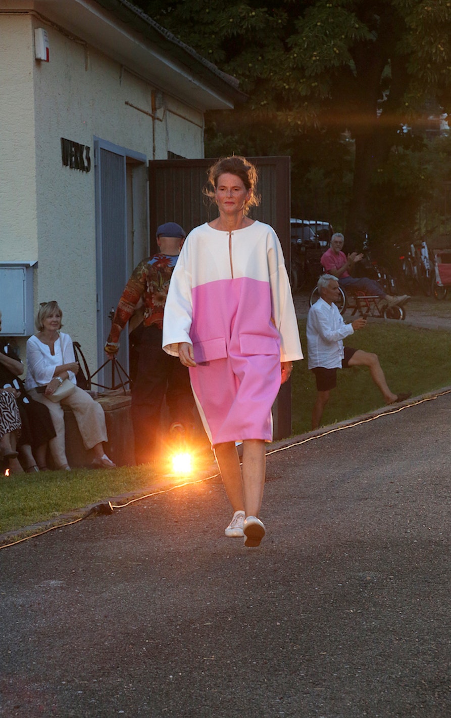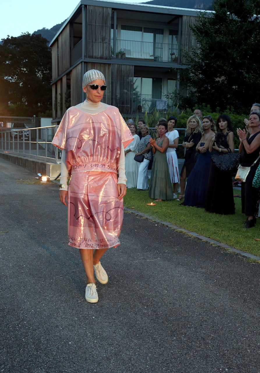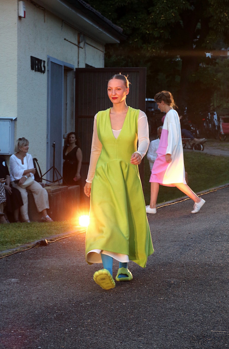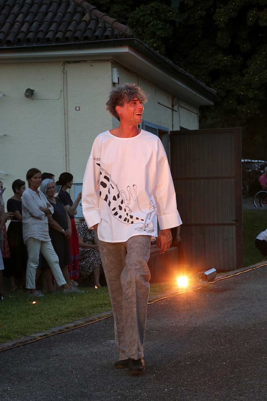 Da Mode immer auch visuell erfahrbar sein sollte, gab es dazu eine Fashion Show. Im November 2022 zeigte die in Bozen lebende bulgarische Designerin Violeta Nevenova im Kraftwerk Rendelstein eine Auswahl ihrer Arbeit: alles Einzelstücke, handgefertigt aus Reststoffen. Eine andere Jahreszeit, neue Entwürfe – wir entschieden uns dazu, dass Violeta auch diesen Abend mit ihren Designs bespielen sollte. Diesmal fand die Fashion Show draußen statt, vor der alten, stillgelegten Kraftanlage Rendelstain. Wir hatten Glück mit dem Wetter, die Hitze war erträglich und wir haben einen wunderschönen Abend miteinander verbracht.