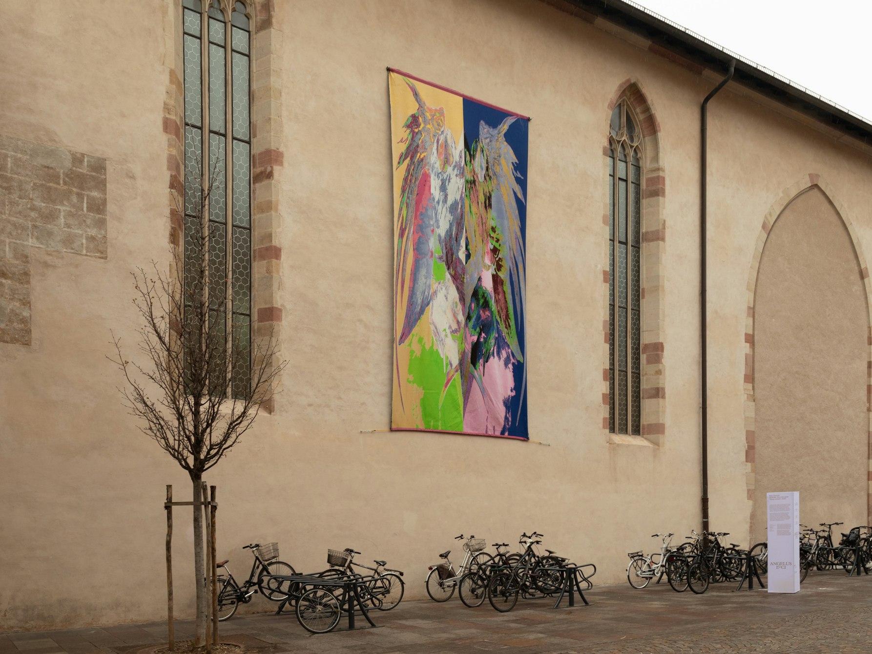 Se vi trovate in Piazza Domenicani, lasciate correre lo sguardo lungo la parete laterasinistra della Chiesa. È una visione inaspettata quella che vi si para davanti: un enorme arazzo rettangolare (6,8 x 3,4 m) tessuto a colori accesi con inserti dorati, appeso tra i palazzi con robusti cavi metallici. Di giorno l’arazzo scintilla al sole, imponendosi alla vista, la notte si fonde con la città, tra le ombre disegnate dai lampioni.