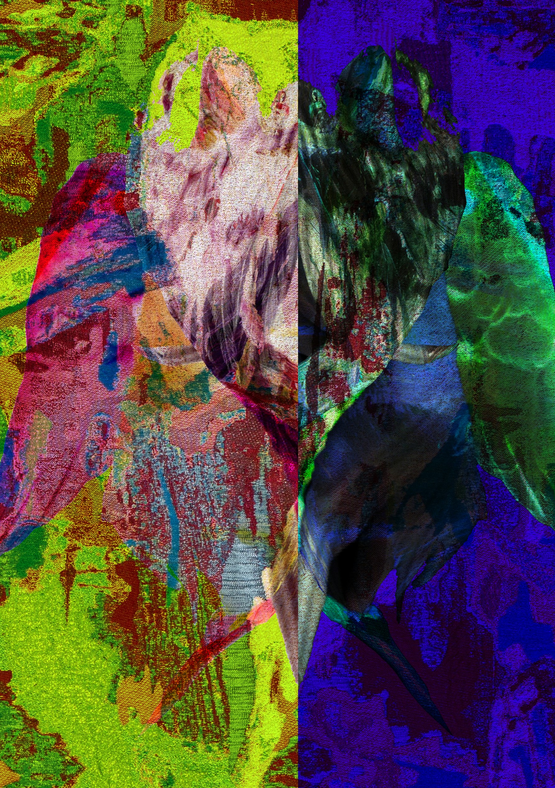 Ho scelto l’arazzo in tessuto Jaquard per creare un’opera di grandi dimensioni, pur essendo fondamentalmente, una pittrice. In quest’ultimo anno ho sentito forte l’esigenza di uscire dalla bidimensionalità del quadro e portare la pittura nello spazio attraverso altre tecniche e materiali, tra cui il tessuto. La mia passione per il tessuto viene anche dalla fascinazione verso altre culture, penso per esempio alla lavorazione dei tappeti Kilim – che seppur con un’altra tecnica – sono realizzati site specific, apportando energie diverse nel luogo in cui sono custoditi e vissuti, a seconda delle raffigurazioni che presentano. In questo lavoro, alla base c’è comunque la pittura: ho selezionato parti e dettagli di un mio quadro che ho fotografato ad altissima risoluzione e ricomposto a computer. I dettagli svincolati dal loro contesto originario perdono riconoscibilità e acquisiscono un nuovo status espressivo: macchie di colore e singole pennellate ricomposte che vanno a creare un “humus” da cui partire per la creazione di nuove opere. Un tema a me caro in pittura e che qui ritorna, è quello della distruzione/creazione: prendo qualcosa di finito, lo vado a rompere per creare qualcosa di nuovo come in un ciclo vitale. I colori sono i “miei colori” che utilizzo in pittura. Ho voluto anche inserire il tema del “positivo/negativo” e il gioco degli opposti: opposti come vita/morte, uomo/Dio, salute/malattia, morte/rinascita. Quindi ho scelto colori molto contrastanti tra loro, oltre all’oro, realizzato con fili di lurex, – che richiama un po’ di più l’immaginario del Natale tradizionale e fa letteralmente brillare l’arazzo.
