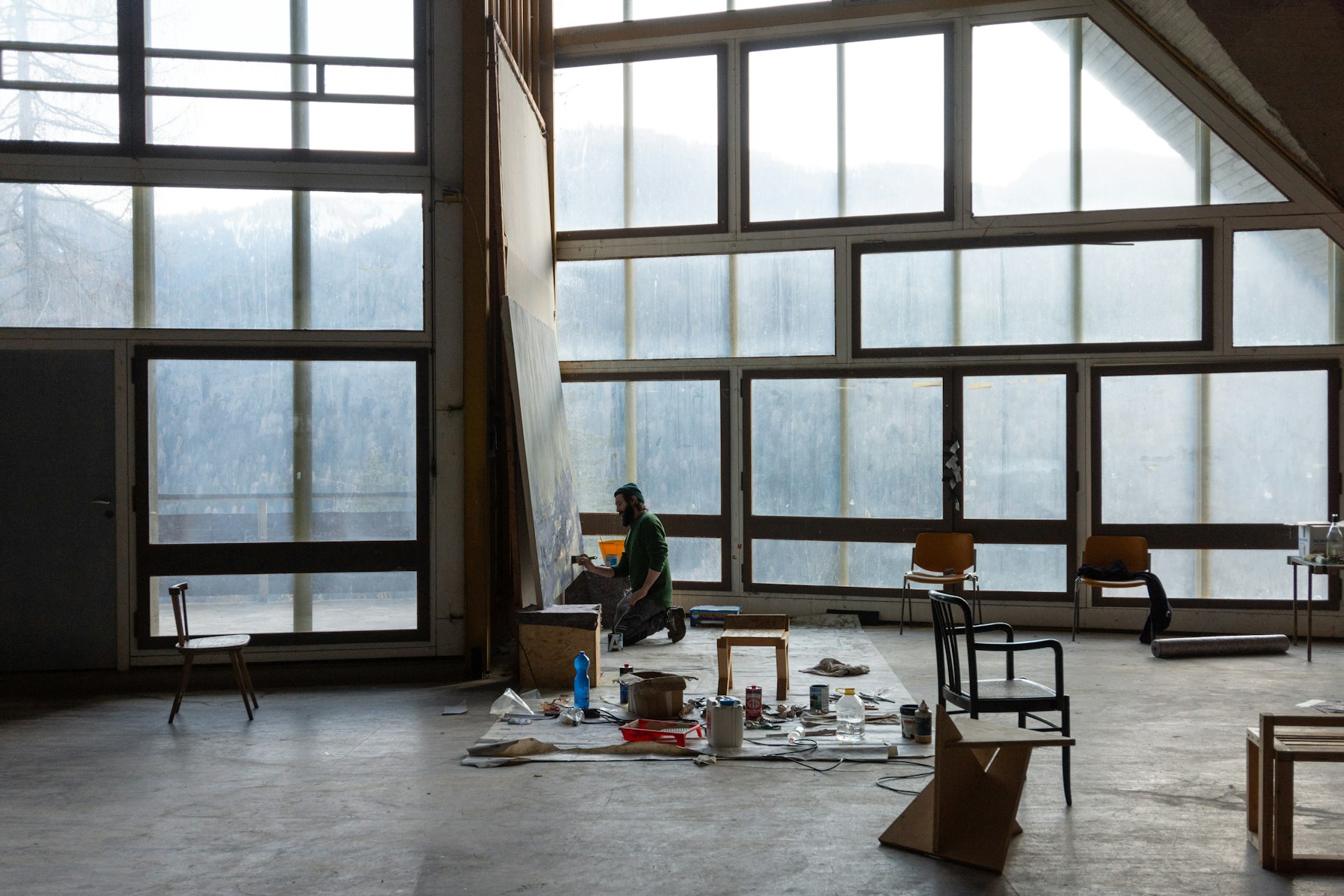 Una foto interessante è quella del Ponte Cadore, a Calalzo, che sovrasta Perarolo e la sua vecchia strada panoramica: l’immagine ritrae questa grande infrastruttura dai colori forti, arancio e blu elettrico, stagliata sul bosco e sulla montagna, un pattern di abeti e pini. Rappresenta bene la prima parte del progetto, quella dei grandi cantieri senza la presenza fisica dell’uomo. Poi ci sono i ritratti degli artisti: scelgo una foto di Nicola Facchini, colto in pieno inverno mentre dipinge nell’aula magna di Borca di Cadore, un locale fermo dal ’92: dal 2011 è un cantiere sperimentale e non è riscaldato. Appena prima di quello scatto mi aveva detto: “Ho messo fuori un secchio perché, quando l’acqua si ghiaccia, forse è il momento di rientrare in residenza”. Nel suo sguardo si coglie il divertimento.