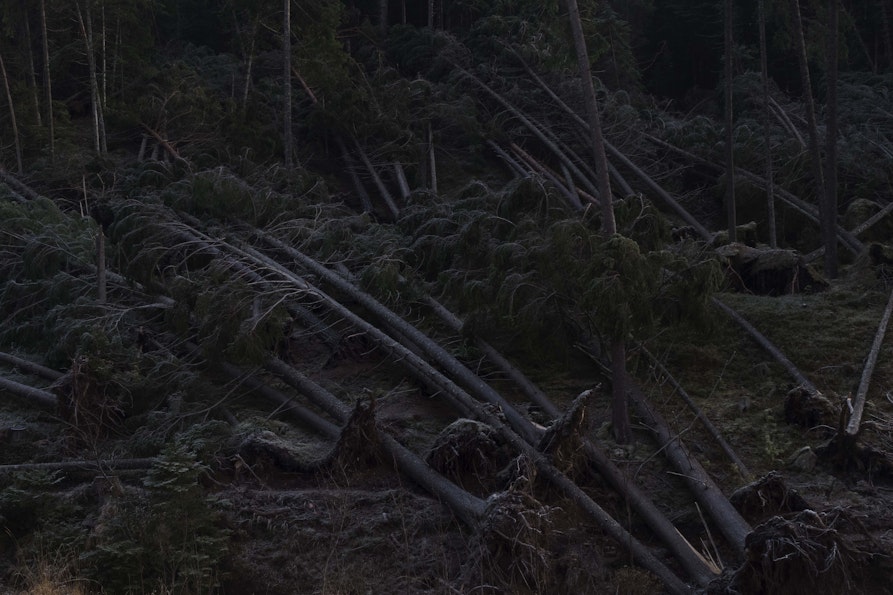 Nel progetto “We Are Here” ho scelto di non inserire figure umane in contesto paesaggistico; la natura è l’unico soggetto. Ogni foto rappresenta la ribellione della natura contro ciò che l’uomo tenta di imporle. Contestualmente ho realizzato ritratti di persone che vivono in simbiosi con il territorio, come i membri della Magnifica Comunità di Fiemme, che sono co-proprietari del bosco. Questa comunità vive la tragedia con profondo rispetto e dolore e ho potuto cogliere le emozioni contrastanti di chi dedica la propria vita alla cura del bosco. Le testimonianze sono state un viaggio tra lacrime e speranze, rivelando un legame intimo e profondo con la terra.