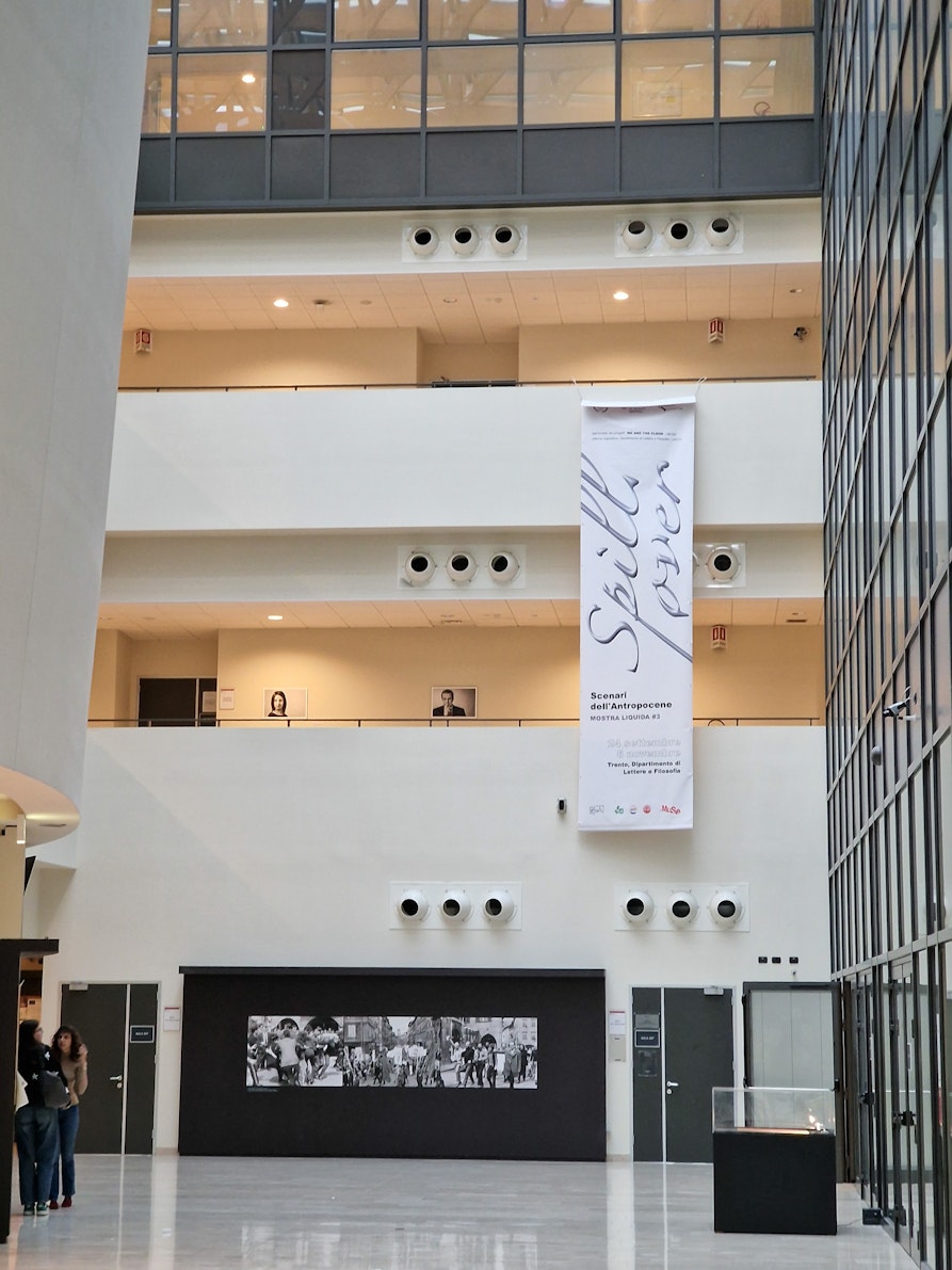 Ecco cos’è “Spillover: scenari dell’Antropocene”, la terza mostra liquida aperta a Palazzo Prodi, nell’atrio Nord del Dipartimento di Lettere e Filosofia in via Tommaso Gar 14 a Trento, fino al 6 novembre. Uno “spillover” appunto, un traboccamento da un ambito all’altro che porta con sé effetti conseguenti e laterali, effetti che l’arte consegna al nostro sguardo e al nostro pensiero, ma soprattutto alla possibilità di rendere l’arena degli spazi accademici anche uno spazio di lentezza, uno spazio in cui fermarsi, riflettere collettivamente e prendere voce. È proprio quest’ultimo il punto che più mi ha colpito, vedere un gruppo di studentesse reclamare questo diritto: il diritto di parlare, di prendere voce e di prenderla insieme, di ascoltare per discutere, di ascoltare per rendersi parte attiva di un processo trasformativo, di ascoltare per farsi ascoltare, chiedendo un’apertura degli spazi universitari all’arte, alla riflessione e all’esperienza visiva. Per essere gocce che creano cerchi concentrici sempre più grandi, gocce che cadono su superfici calme e immobili da troppo tempo, motore liquido che dà corpo al cambiamento.