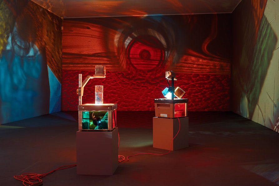 Man betritt eine faszinierende Welt aus Licht und Farbe, Materialien und Formen, Illusion und Realität in der aktuellen Ausstellung In Fire Yet We Trust von Neda Saeedi im TaxisPalais Kunsthalle Tirol in Innsbruck. Massive Metallstrukturen, filigrane Glasarbeiten und verschlungene industrielle Rohre formen komplexe Skulpturen; kaleidoskopartige Projektionen tanzen über die Oberflächen und verändern den Raum mit jedem Schritt. Schwebende Glaselemente, die wie durchsichtige Inseln im Raum verteilt sind, wurden leicht und präzise platziert. Es ist ein Füllhorn an Eindrücken – und doch wirkt alles harmonisch zusammen, niemals zu viel.