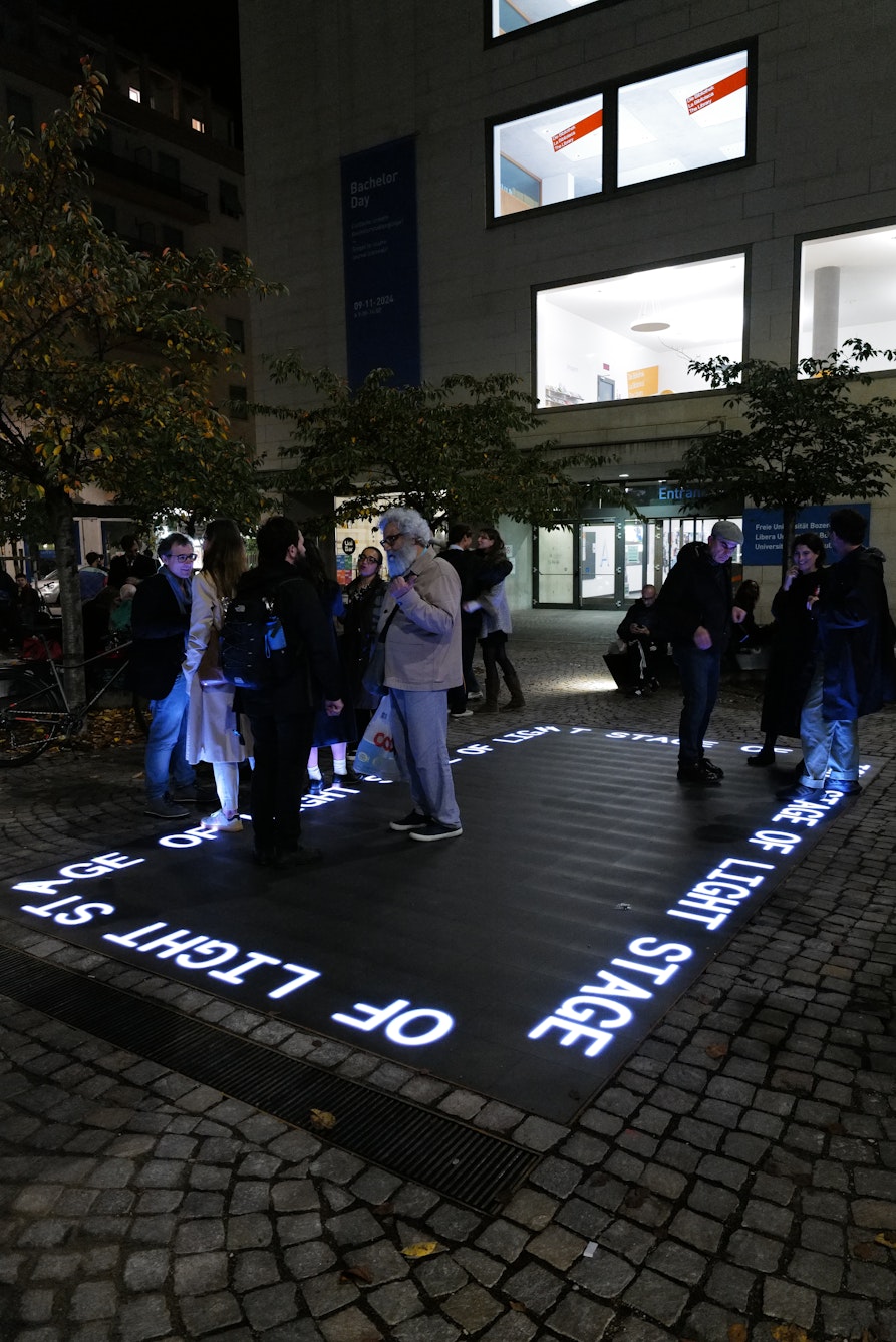 Was passiert gerade auf dem Platz vor der Uni in Bozen? … am Samstag, 26. Oktober 2024 um Punkt 18:00 ist es endlich soweit: Der Teppich wird beiseite gerollt, der Vorhang fällt, der Schleier wird sich heben und eine drei mal fünfeinhalb Meter große, begehbare, rutschfeste Lichtbühne freigeben.