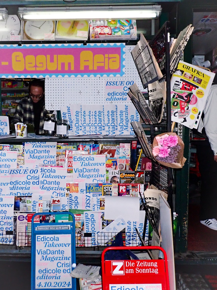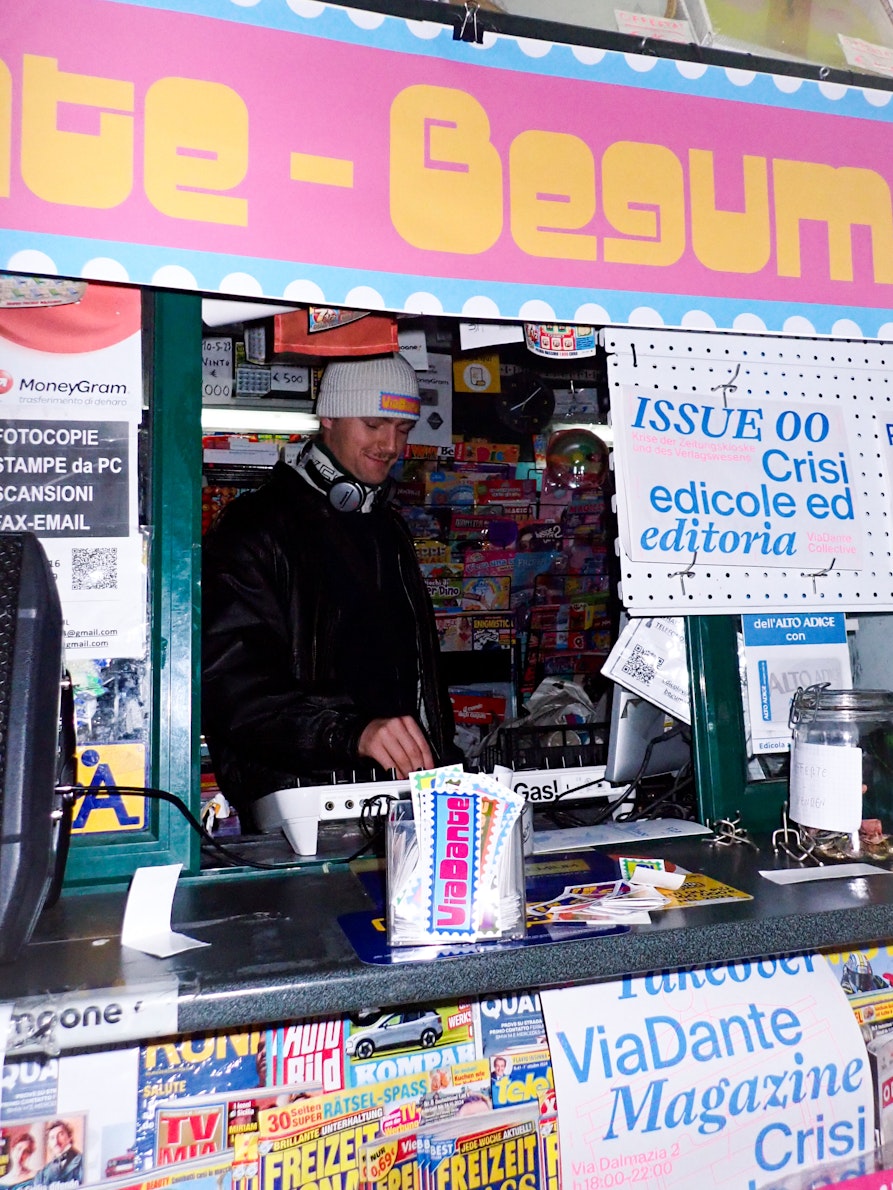 Dieses Bewusstsein will ViaDante durch verschiedene Veranstaltungs-Formate und Kollaborationen wie die des Takeovers schaffen. Diese Idee zeigt besonders gut, wie der kollaborative Ansatz eines wirklich alternativen Angebots auch in Bozen fruchten kann. Im Rahmen der Takeovers sollen Orte des kulturellen urbanen Lebens mit einer Veranstaltung neu erweckt werden und somit Konfrontationen bewirken, die im Alltag vielleicht nicht stattgefunden hätten. Im Fall des ersten Edicola Takeover heißt das konkret, die soziale Kraft der Alltags-Ikone Kiosk zu feiern und sie anhand eines Magazins und verschiedener Zusammenarbeiten zu veranschaulichen. Laut Gründungsmitglied Samuele konnte das Kollektiv für das erste Event „nicht nicht beim Kiosk anfangen“ und somit für den Launch ihrer eigens produzierten ersten Ausgabe des ViaDante Magazine.