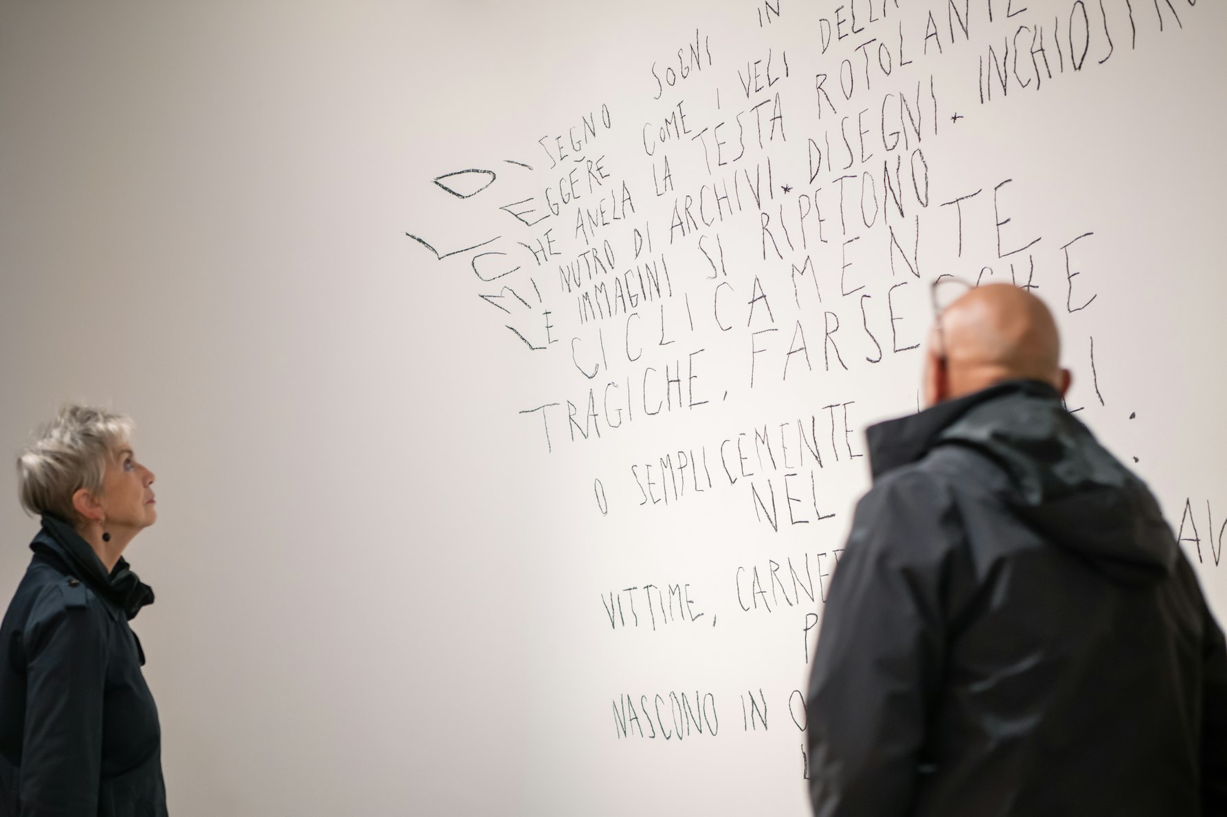 Di particolare interesse è poi l’intervento sul muro della Galleria, un’opera site-specific realizzata con la mano sinistra, come parte di un progetto che l’artista porta avanti da anni. Scrivere con la mano non dominante diventa qui un gesto simbolico, un atto di esplorazione del proprio sé. La scrittura “incerta” della mano sinistra è una danza tra ciò che è conosciuto e ciò che è ignoto, un’uscita dai confini familiari per espandere l’identità e il linguaggio. Il segno sul muro è il riflesso di un’identità che si dilata, che si muove tra sicurezza e vulnerabilità, in bilico tra il sé e l’altro. Questa tecnica è una forma di “rituale” che risuona con il carattere sacro dell’esposizione, aggiungendo un ulteriore livello di introspezione.