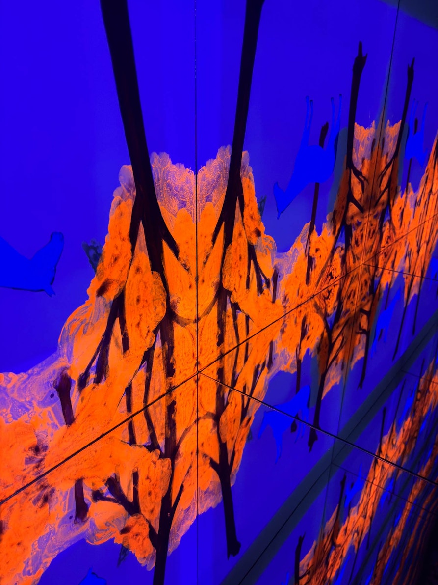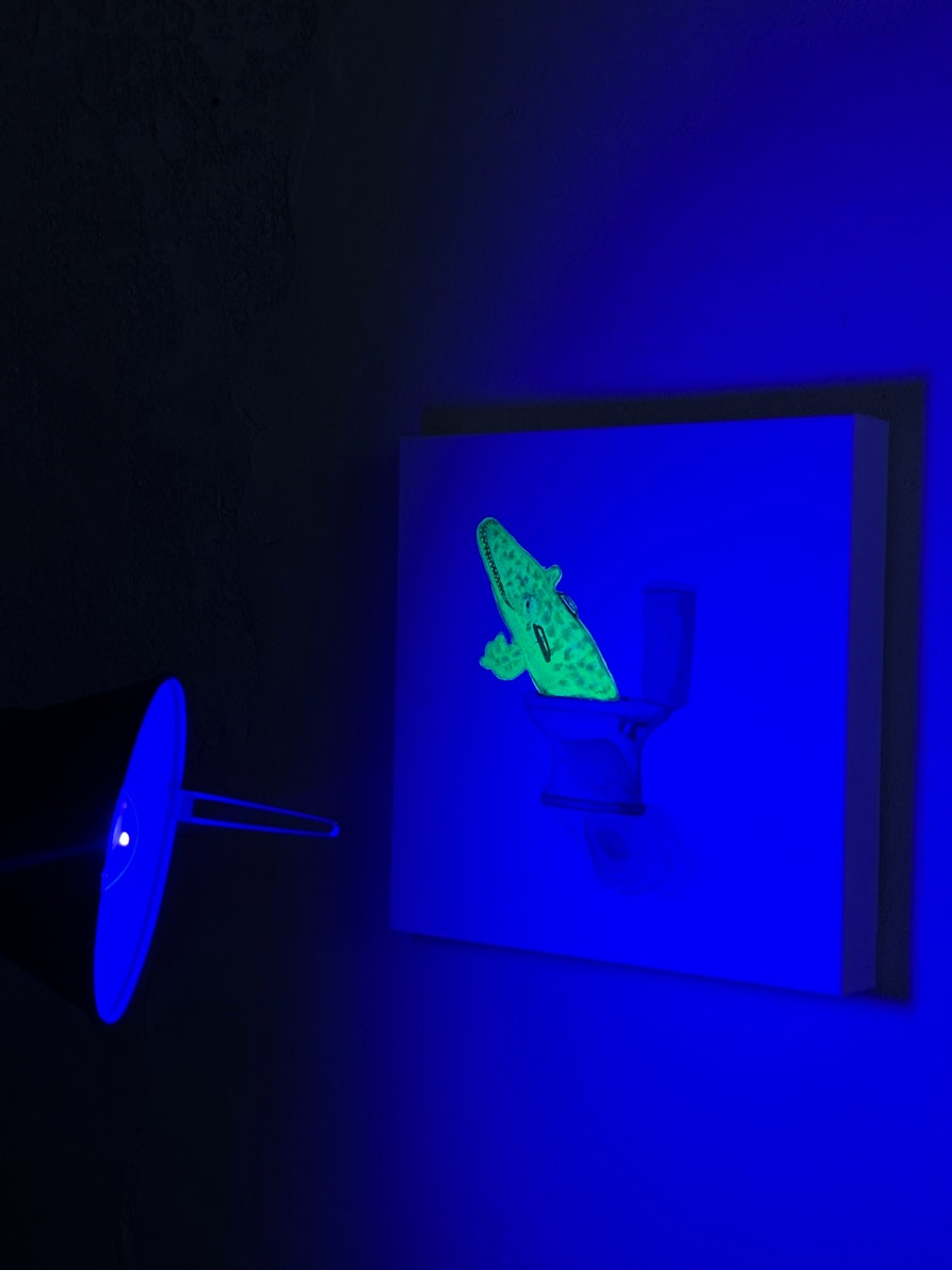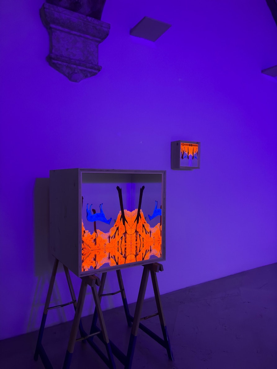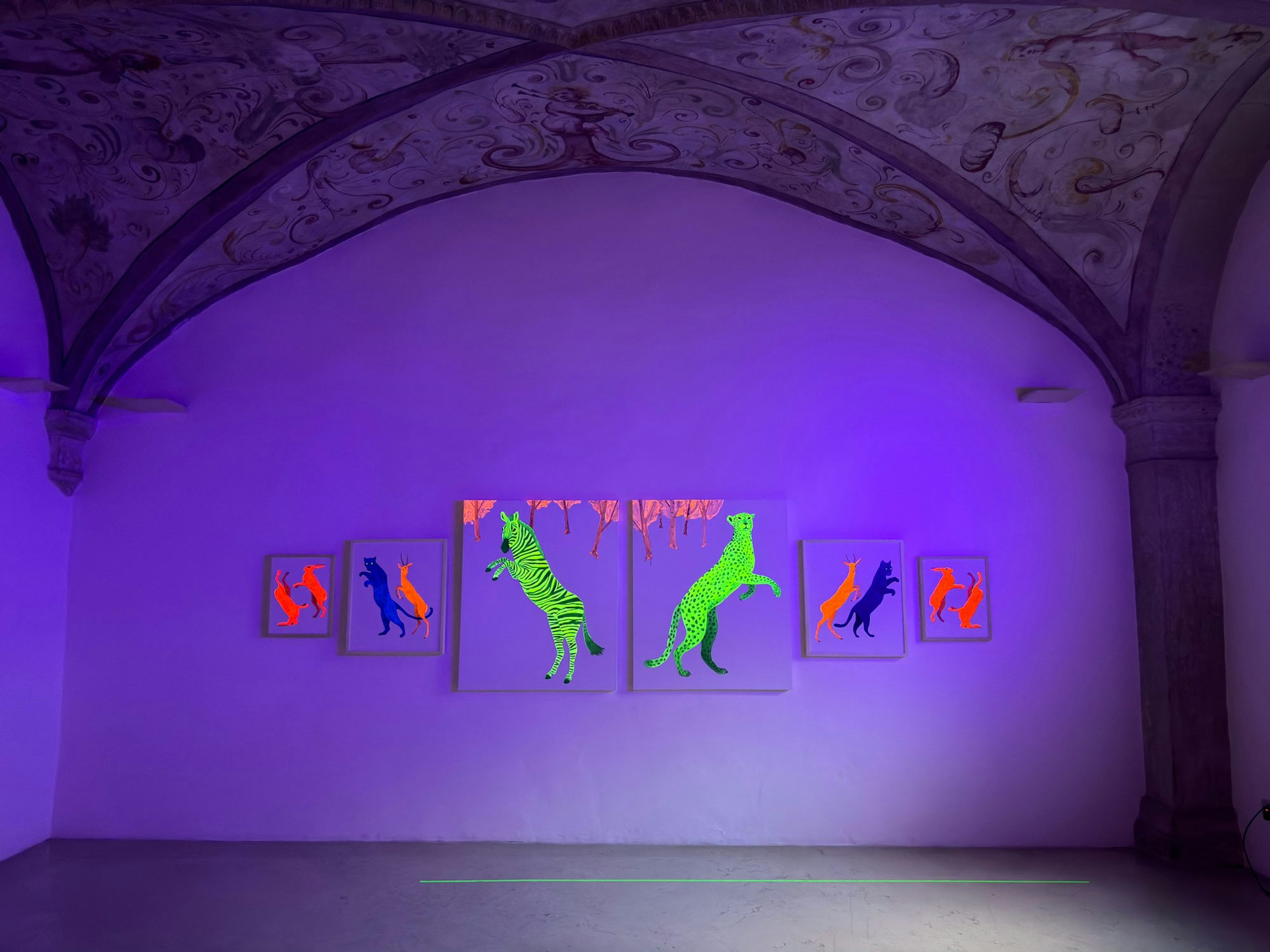 Insomma palpebre chiuse, come sipari che mi separano dalla realtà e mi teletrasportano nel passato, basta un attimo ed eccomi, sono di nuovo lì: era un giorno di pioggia, la pioggia martellante sul mio ombrello, il mio cappotto imperlato di gocce rimbalzate dalle superfici intorno a me, dal mondo a me, da me al mondo, il cuore spento, dello stesso colore plumbeo del cielo, anche lui zuppo. Lascio un mondo grigio, spento, stanco, rassegnato e apro le porte dello Studio d’Arte Raffaelli, in via Marchetti 17 a Trento, e il battito ricomincia. Sono in un altro mondo, sono nel mio mondo, ma al contempo sono in un’altra dimensione, sono in un altro battito, basta un attimo e il mio e quello di quel mondo a me tanto estraneo e tanto familiare al contempo si allineano. Sento lo sguardo riscaldarsi, le ciglia rigide sciogliersi, gli occhi farsi farfalle, abbandonarmi e volare via attratti dai colori fluo, sbattere le ali a ritmo tra foreste infuocate, animate da balli rituali di animali risucchiati in una notte sospesa nel tempo.