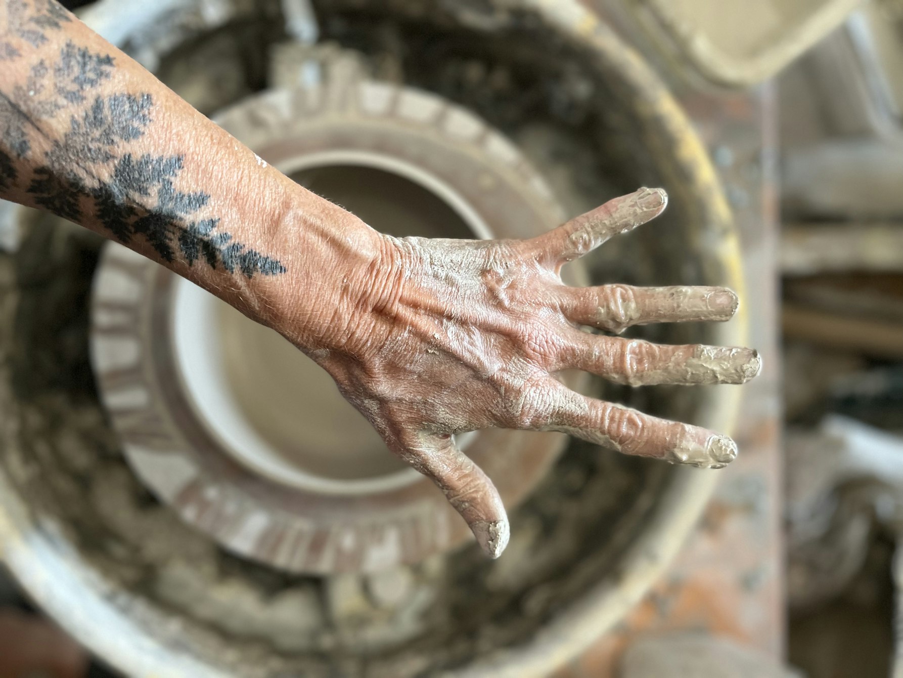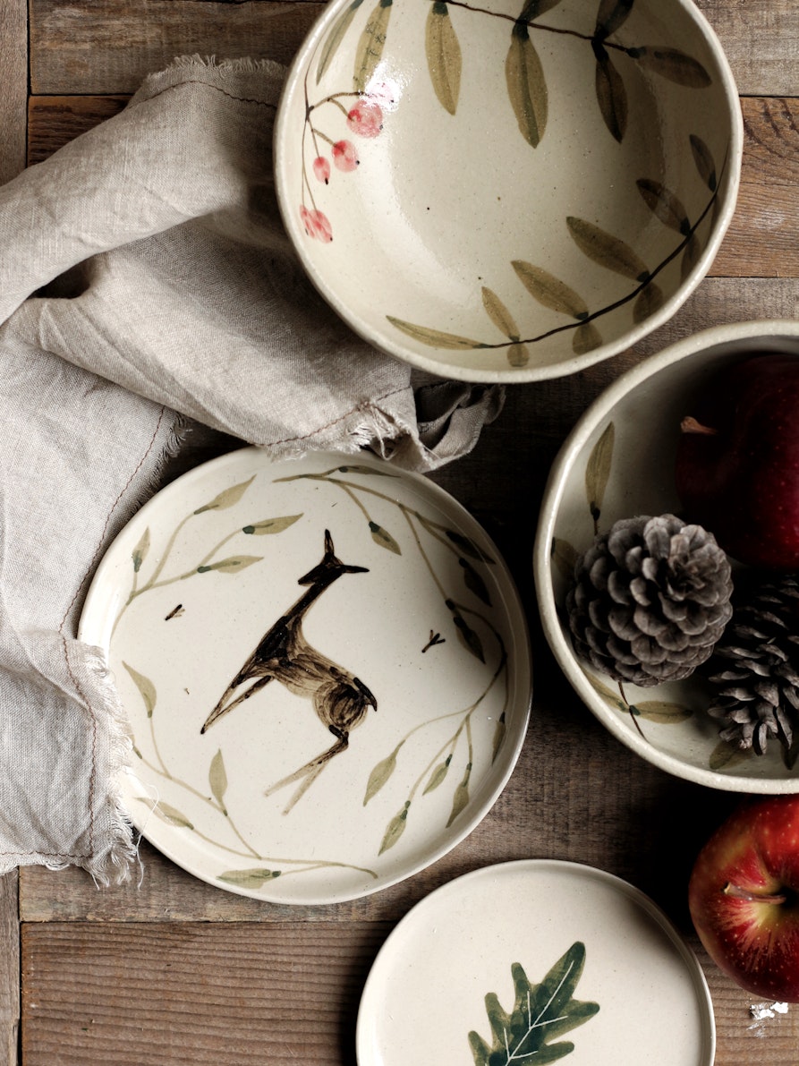 La scelta dei materiali è profondamente legata alla tavolozza della terra e ai suoi toni caldi. Il gres, in particolare, offre molte possibilità espressive. La mia connessione con il bosco è così intensa che le ceramiche che creo e progetto per la primavera differiscono nettamente da quelle dell’autunno, anche esteticamente. Ogni stagione porta con sé una palette unica; i profumi dei fiori e della frutta cambiano completamente. Da agosto in poi, ad esempio, l’energia del bosco si trasforma. Per questo, quando dipingo su porcellana, i temi si adattano alla stagione: imprimo nell’argilla solo ciò che la natura offre in quel momento specifico dell’anno. Alcuni tipi di felci, ad esempio, resistono anche sotto la neve, e le foglie possono essere essiccate e usate in altri momenti. Non è solo il bosco a guidare il mio lavoro, ma anche il ritmo ciclico dell’anno, il passare del tempo e lo scorrere dei giorni, che influenzano ogni creazione.