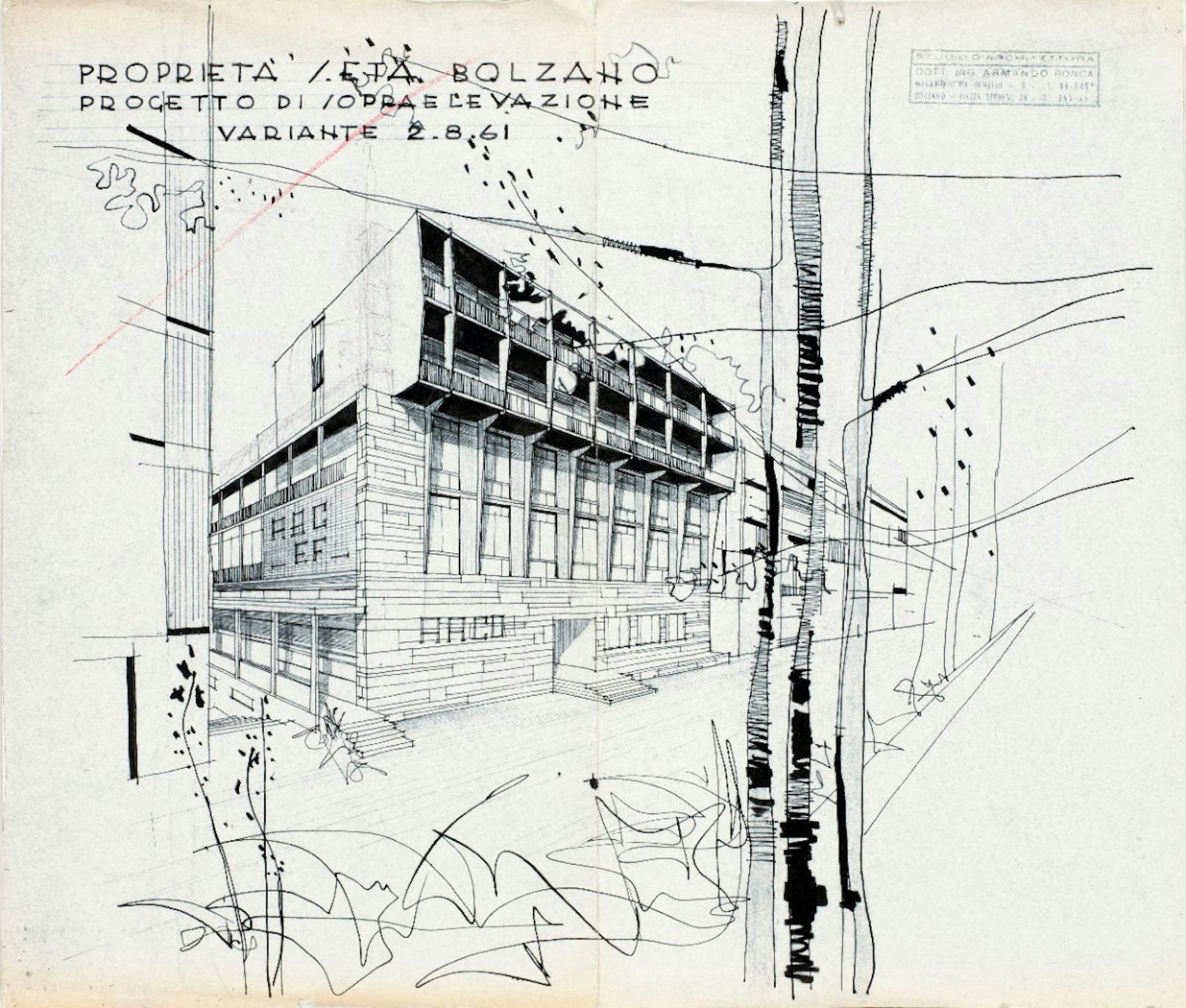 Ma è in Alto Adige che Ronca trova la sua tela ideale: le città di Bolzano e Merano negli anni della ricostruzione postbellica si trasformano grazie alle sue visioni moderniste. Se la nuova sede di franzmagazine, Palazzo Vanzo, è un simbolo dell’approccio razionale e innovativo di Ronca, un edificio che si impone per la sua funzionalità e il suo impatto estetico e dinamico, ancora oggi la sua presenza rimane palpabile in opere come “La Torre” delle Case Ina di via Sassari: uno dei primi grattacieli del capoluogo che rappresenta un’autentica pietra miliare dell’urbanistica del secondo dopoguerra. Da sempre ispirato al maestro Le Corbusier, Ronca ha firmato oltre trenta edifici solo tra Bolzano e Merano, contribuendo a delineare i paesaggi urbani con un’architettura iconica e audace. Tra le sue opere spiccano Villa Cembran (1935), Palazzo de Eccher (1961), l'Hotel Astoria (1963) e il complesso Ariston (1965) nella città del Passirio.