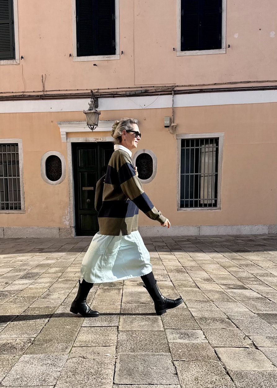 Die Socials sind voll mit Influencer*innen, die uns vollsabbern mit permanent neuen Outfits und Fashion-Trends, neuen Beauty-Produkten, Haarföns, bei Frau über 50 gerne mit Tipps zu Bauchfett und Krampfadern. Natürlich kann frau sagen, da mache ich nicht mit. Die Socials interessieren mich nicht. Ist aber gar nicht so einfach, sich da wirklich abzuschotten. Die Algorithmen sind gnadenlos. Ich kann von mir nicht behaupten, dass ich gegen diese Welle gefeit wäre. Vor allem nicht bei Leuten, deren Stil ich schätze, Brands, die ich mag und Marken, die ich gerne unterstütze. Das, was ich mir angewöhnt habe, ist zu warten. Die meisten virtuellen „Einkaufswägen“ schließe ich wieder. Auch bei Secondhand bin ich immer wieder verführt, wenn ich was richtig Tolles finde, greife ich zu.