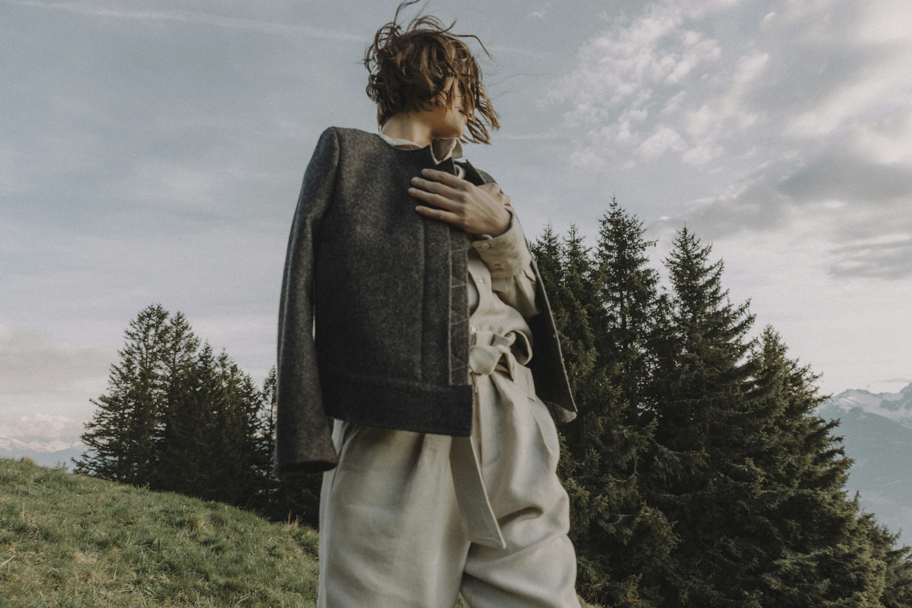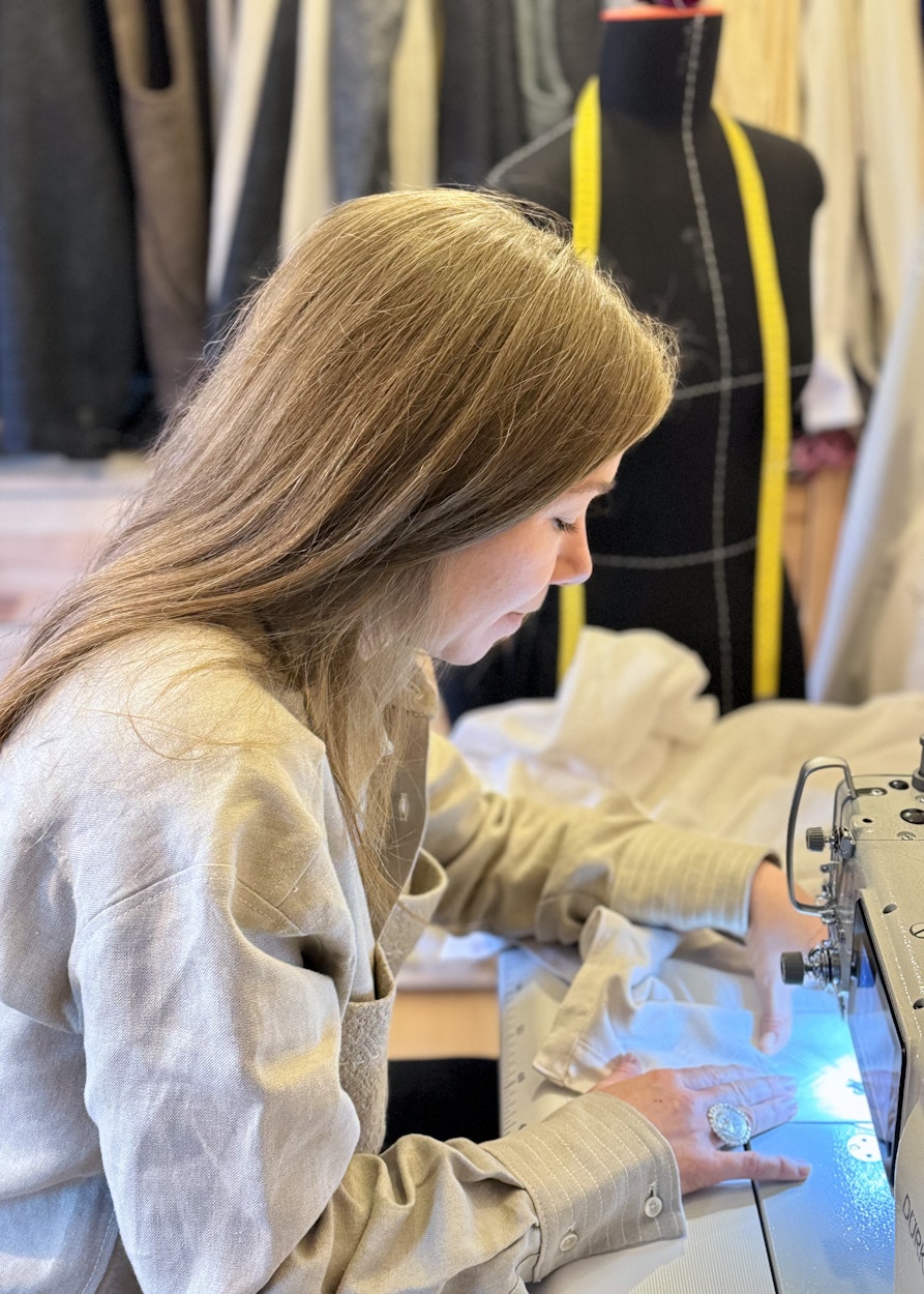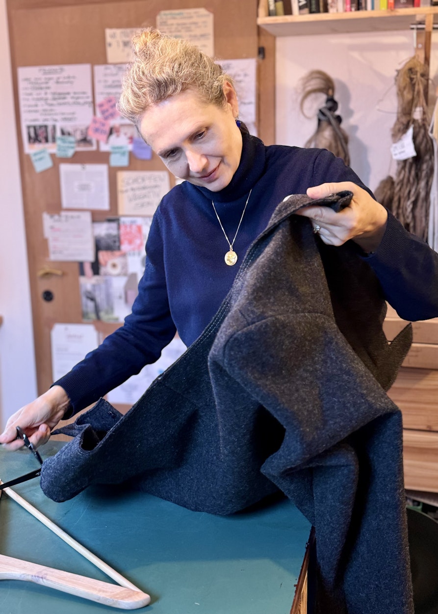Ich habe bewusst ein ganzes Outfit entwickelt, es besteht aus Hose, Hemd und Jacke. Die Jacke ist aus Schafwolle, Hose und Hemd aus Leinen. Die Hose ist sehr größenvariabel, sie wird an der Taille geschoppt, für das Hemd wurde ein klassischer Herrenschnitt für Damen adaptiert, ich beziehe mich explizit auf Workwear, weil mir Handwerk und Landwirtschaft wichtig sind. Die Jacke soll so edel wie möglich aussehen, mit modernem Twist, sie ist großzügig geschnitten mit weitem Halsausschnitt. Die Häkchen, die ich verwende, source ich Vintage in Frankreich, die Knöpfe kommen aus dem Nachlass einer nicht mehr aktiven Fabrik am Chiemsee.