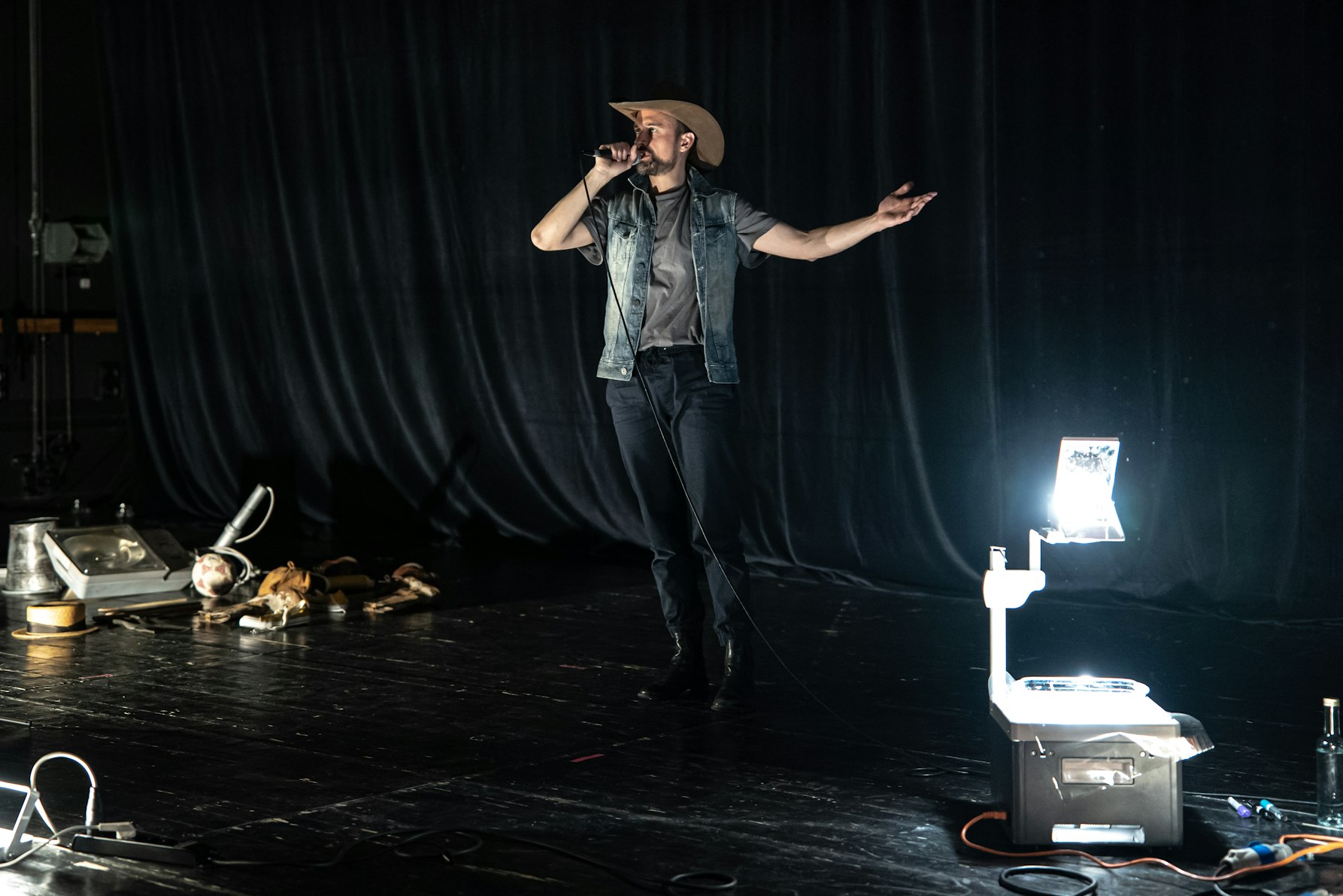 Indem wir etwa versucht haben, das Stück in einem so intimen Rahmen wie möglich stattfinden zu lassen, um dadurch nahe am Publikum zu sein. Außerdem haben wir uns sehr viel auf die Erzählung verlassen. Es gibt immer wieder Spielmomente, in denen ich in die verschiedenen Charaktere hineinschlüpfe, die Grenzen zwischen Erzähler und Figur verschwimmen ständig miteinander. Darüber hinaus mache ich sehr viele der Sounds mithilfe von Loopstation und Synthesizer, aber auch Gegenständen und Requisiten selbst. Das ist eine musikalische Basis, die im Laufe der Aufführung den Raum weiter öffnet. Auch das Licht, das bis fast zum Schluss wahnsinnig reduziert ist, steuere ich selbst. Unsere Idee war die eines Performers, der sich auf der Bühne einnistet. Das mag auf den ersten Blick für das Publikum chaotisch wirken, hat aber alles seine Berechtigung.