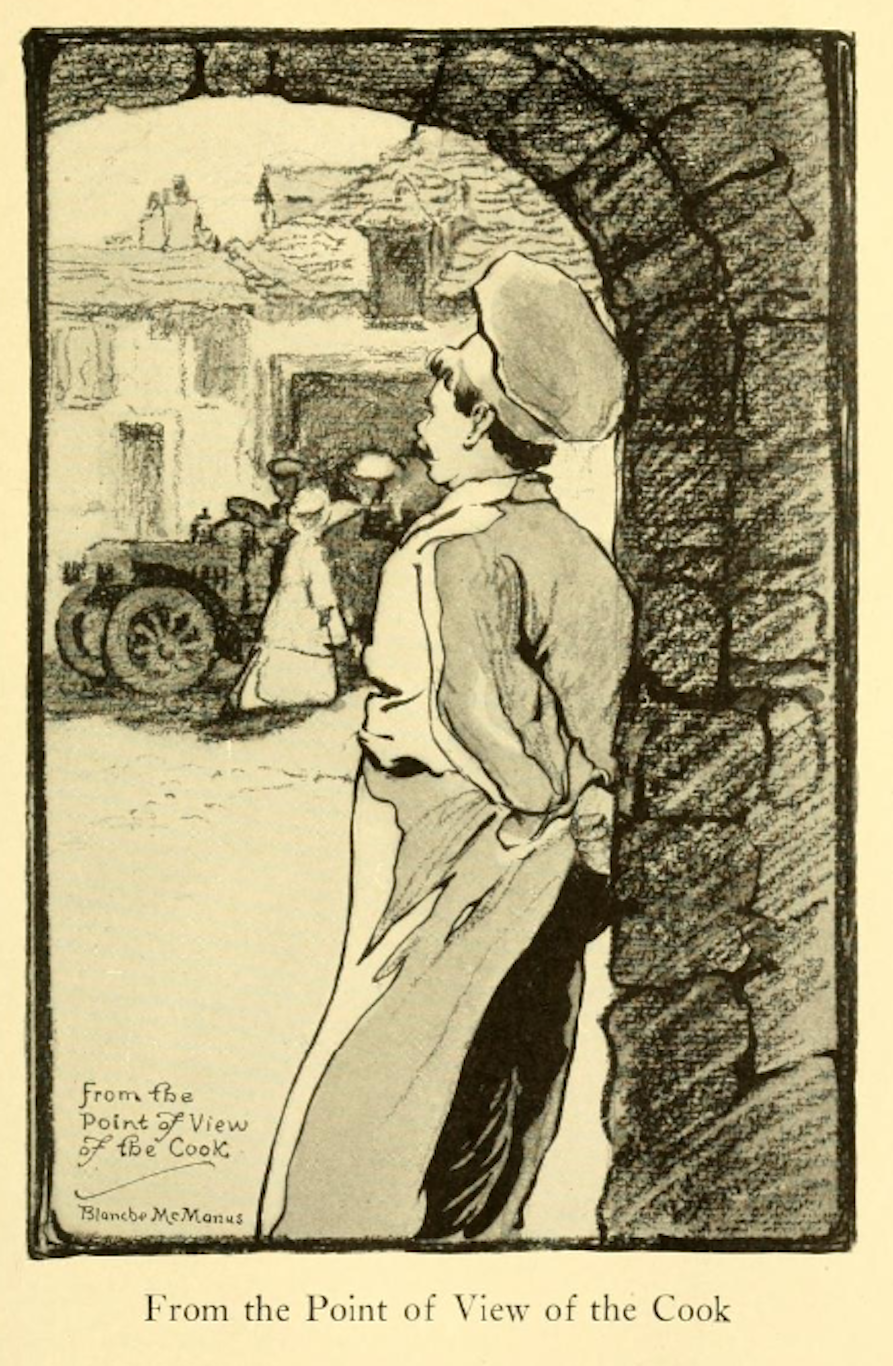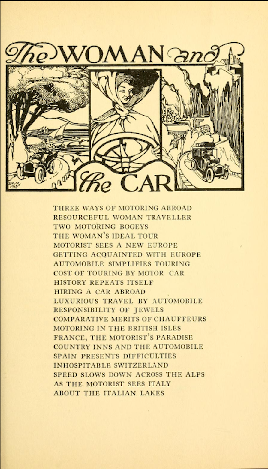 Ein ganzes Kapitel widmete die Schriftstellerin aus Lousiana dem Reisen im Automobil. Darin sah McManus die idealste Reiseform für Frauen, da sie neben dem Chauffeur keiner weiteren männlichen Begleitung bedurfte und es doch ermöglichte, Land und Leuten nahe zu kommen. Gleichzeitig ließ die Fahrt im Automobil hohe Entscheidungsfreiheit und Unabhängigkeit von den Fahrplänen der Postkutschen und Eisenbahnen zu. Ganz nebenbei bot diese Reiseform auch allen erdenklichen Komfort: Das Dienstmädchen konnte auf dem Beifahrersitz mitreisen. Für reichlich Gepäck mit vornehmer Garderobe, die der Aufenthalt in einem europäischen Grandhotel verlangte, war im Auto genug Platz. Zur Ausstattung des Wagens gehörten ein Teekorb mit Thermosflasche, eine Leselampe sowie ein ausklappbarer Tisch, und bei Bedarf konnte für den Schmuck der reisenden Dame ein kleiner Tresor unter dem Sitz eingebaut werden.