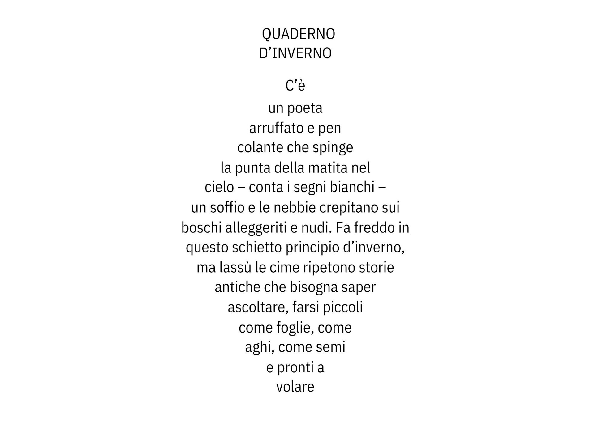 Sono sei “boschi miniati” (poesie scritte in forma di seme o di foglia) innevati, invernali, composti partendo da una indagine intima, fiorita dalla magia della neve che arriva e cambia completamente quel piccolo francobollo di terra che andiamo a esplorare. Fin da bambino l’arrivo improvviso della neve lo trovo un travestimento magnetico e irresistibile.
