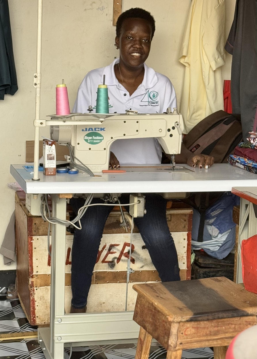 Ich wollte unbedingt einmal dabei sein, wenn Sharon ihre Mode präsentiert. Im Dezember 2024 hat es geklappt. Ich habe die Ecofashion Designerin aus Norduganda virtuell über eine Freundin kennengelernt, die sich dort für ein soziales Projekt engagiert. Vier Interviews haben wir bisher für diesen Blog geführt (Links am Ende des Artikels). Einige Tage vor der Show besuchen wir den Ort, wo Sharon arbeitet. Sie führt uns in ein großes, einstöckiges Magazin mit vielen kleinen, kabinenartigen Räumen. Hunderte von Leuten, so scheint es, arbeiten hier, schneiden zu, nehmen Maß, sitzen an Nähmaschinen, überall Ballen von bunten Stoffen und Nähutensilien „Jeder macht seine eigenen Projekte, wenn große Aufträge hereinkommen, arbeiten wir zusammen, das ist ein großer Vorteil“, erzählt Sharon Anena. „Das Gebäude gehört der Regierung, jede, die hier arbeitet, zahlt anteilsmäßig die Kosten für Strom und Infrastruktur.“ Sharon kommt hierher, wenn sie Aufträge hat, oder wie jetzt, ihre neue Kollektion vorbereitet. Ab nun kann sie aber auch zuhause arbeiten, wir haben eine Nähmaschine für sie aus Österreich mitgebracht.