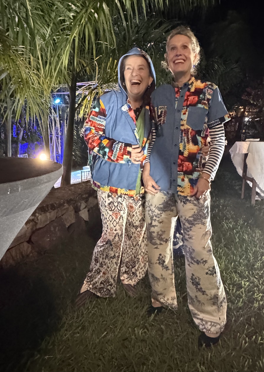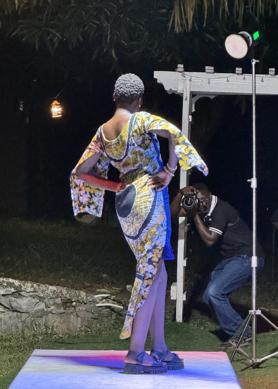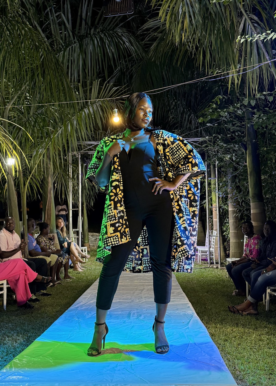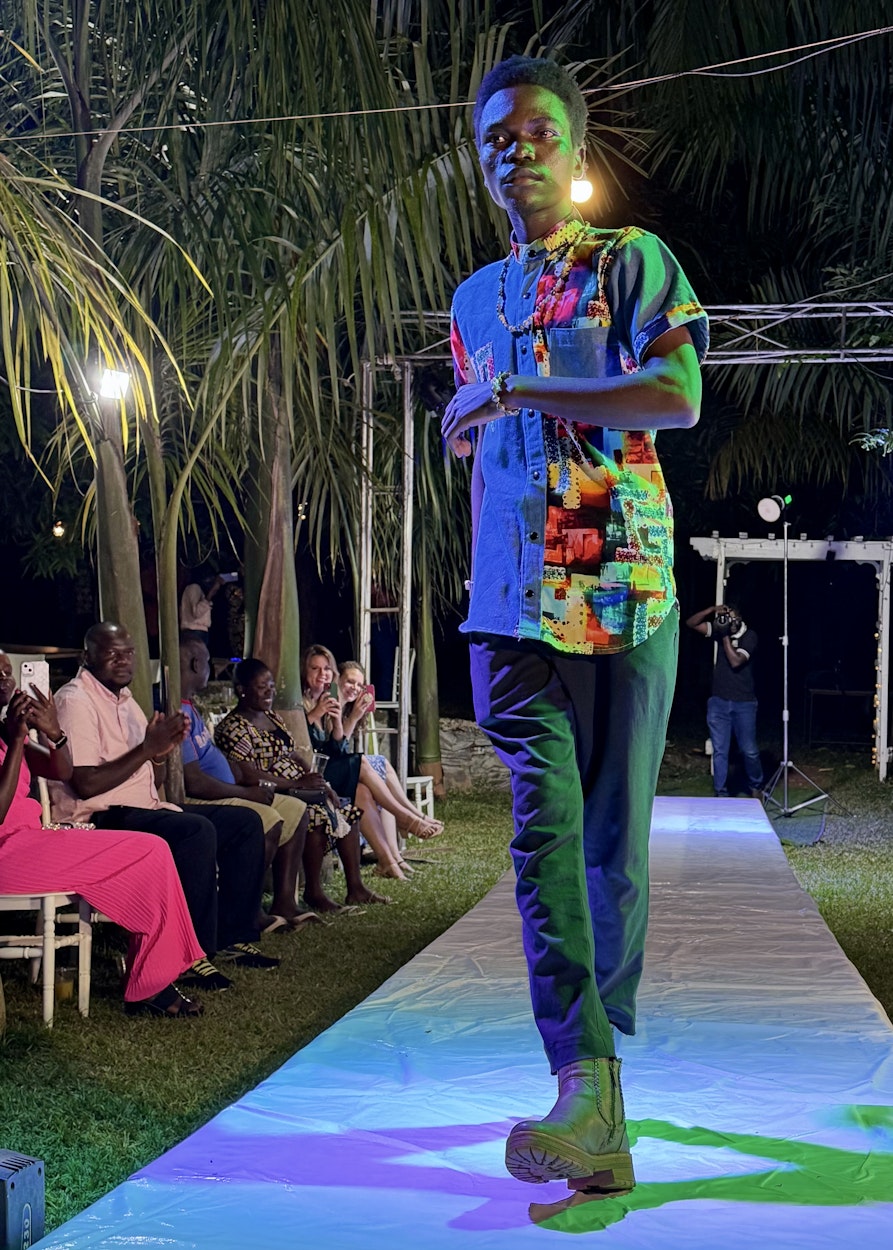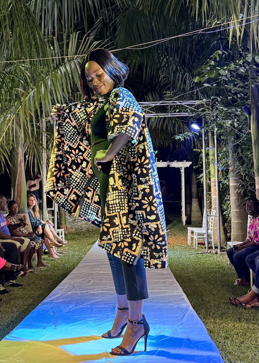 Der Abend war nicht nur liebevoll kuratiert, sondern auch sehr informativ und vor allem war er ein Event des Netzwerkens. Die Kombination von Ernsthaftigkeit und Leichtigkeit in der Gestaltung der Veranstaltung war berührend. In drei Durchgängen hat Sharon ihre Models auf den Laufsteg geschickt, insgesamt waren es 15 Designs, alles Prototypen, die man sich dann in verschiedenen Größen, Stoffen und Prints anfertigen lassen kann. Nach jedem Durchgang wurden die Entwürfe kurz erklärt und die Besucher*innen aufgefordert, sich neben das Model zu stellen, wenn man am entsprechenden Stück interessiert war. Ich habe ein Hemd gekauft, gefertigt aus Jeansresten und einem bunten Baumwoll-Reststoff.