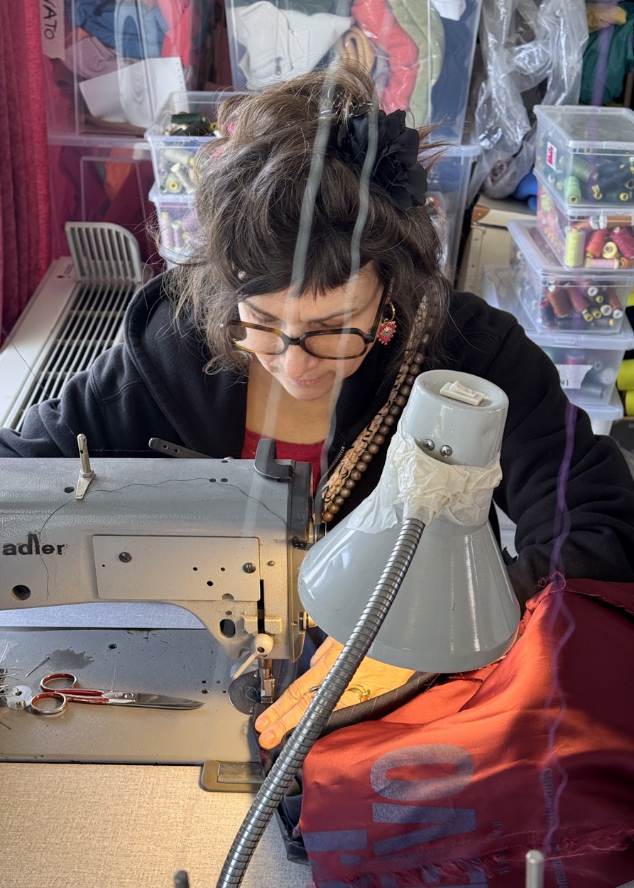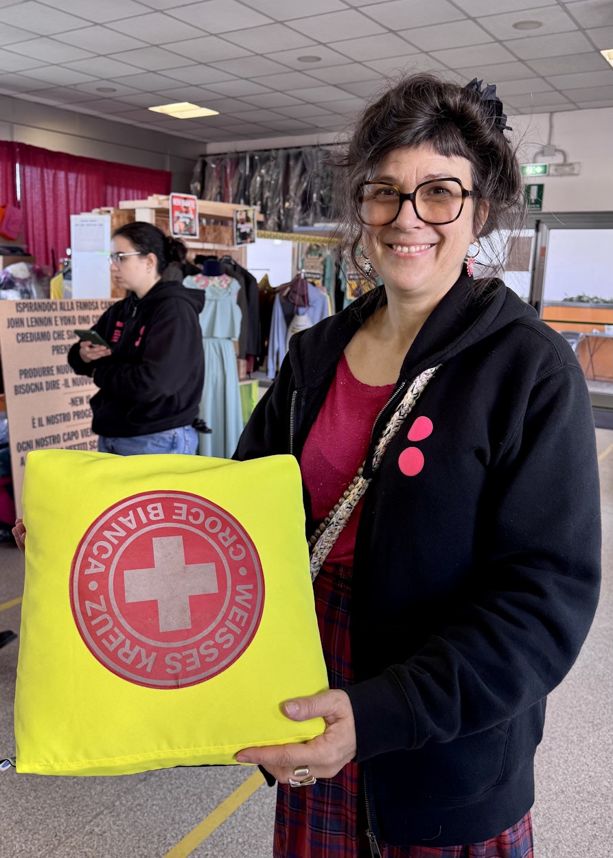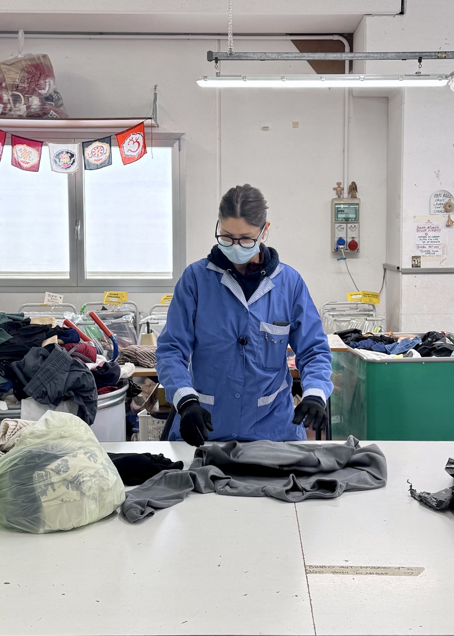 Als ich nach Italien kam, habe ich bei verschiedenen sozialen Projekten mitgearbeitet. Das Soziale ist für mich zu einer sinnstiftenden Ergänzung zu meiner Schneider- und Design-Arbeit geworden. Als mich Insieme kontaktierte, war ich sofort interessiert, denn hier verbindet sich die soziale mit der ökologischen Komponente. Hier arbeite ich mit Kleidungsstücken, die schon da sind, und mache daraus etwas Neues. Mein Ziel ist es, aus Kleidung, Kleidung zu machen. Nicht nur eine Tasche oder sonst ein Accessoire. Immer mit dem Gedanken daran, dass auch dieses Kleidungsstück wieder in den Kreislauf zurückkommen soll. Also passe ich auf, nicht zu viele Materialien zu mixen, und schaue, dass die Zusammensetzung so ist, dass das Stück hinterher wieder leicht recycelbar ist.