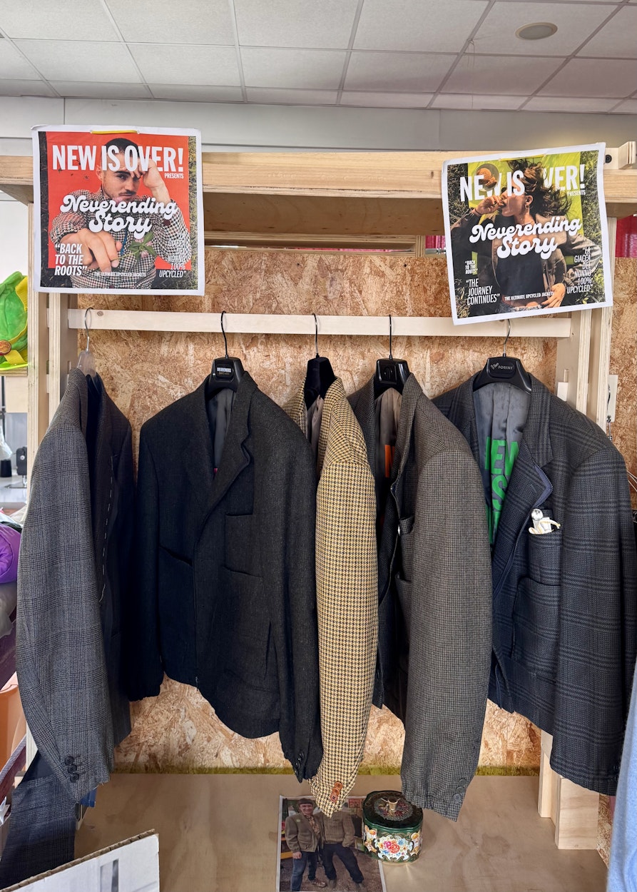 Nach der interessanten Führung und einem sehr guten Mittagessen im angeschlossenen Restaurant Al Barco spreche ich mit Katharina über New is over!. Sie ist ausgebildete Herren- und Damen-Schneidermeisterin, lebt seit langem in Italien und baut seit einigen Jahren das Upcycling-Projekt entschlossen auf. Taugliche Stücke, vor allem Sakkos, Shirts, T-Shirts, Jacken, Hosen und Kleider, werden für sie beim Sortieren auf die Seite gelegt. Daraus entwickelt Katharina dann neue, ungewöhnliche Kleidungsstücke.