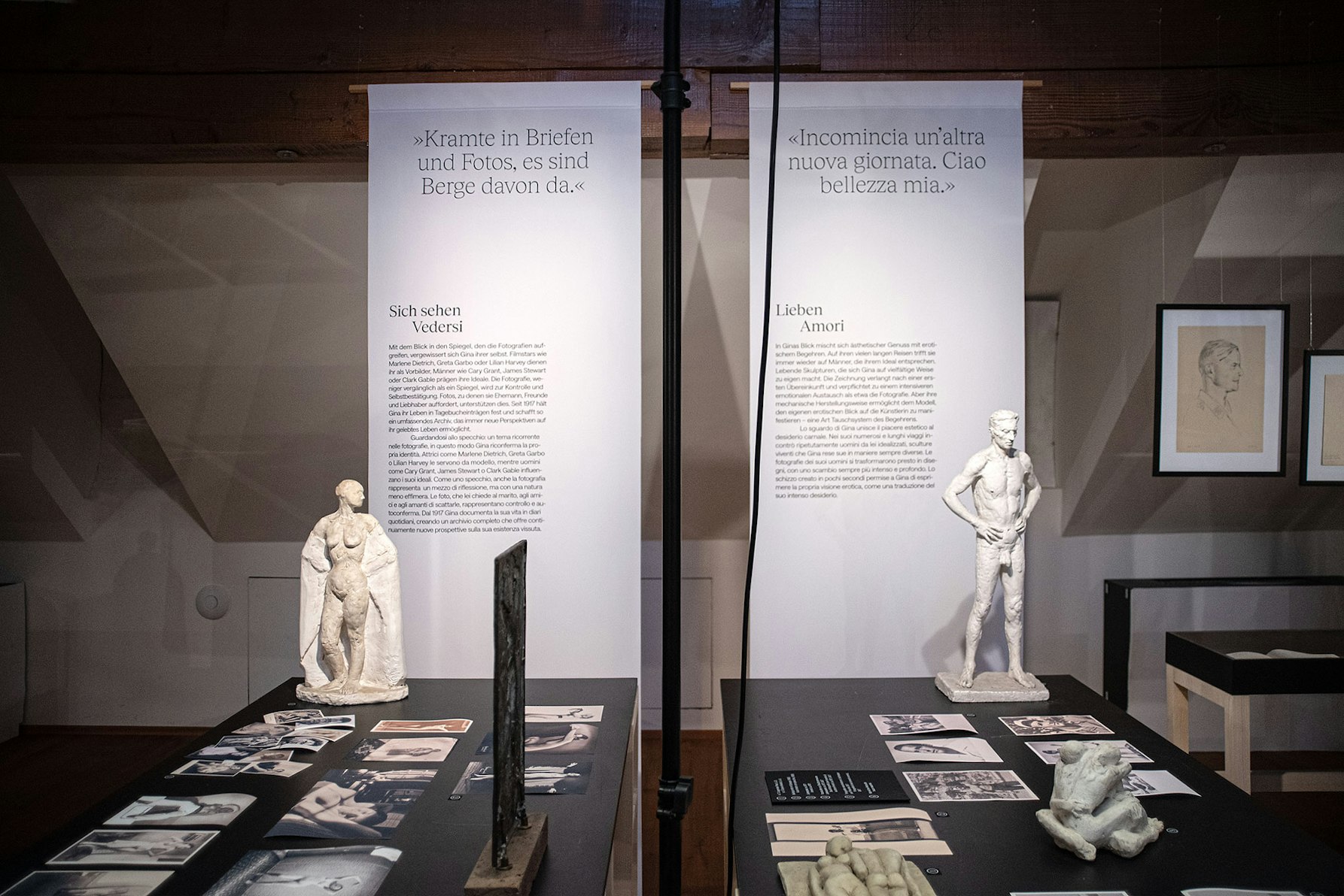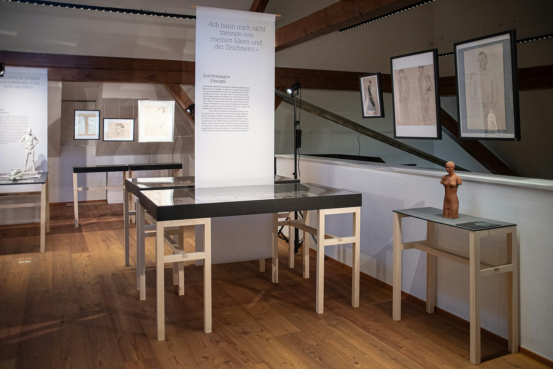 Gina, wer warst du? Diese Frage hat mich ab dem Betreten durch die gesamte Ausstellung begleitet. Die Exposition legt das Werk der Künstlerin ebenso schonungslos offen wie ihr Privatleben, ihre Gedanken und Ängste, Wünsche und Hoffnungen. Gekonnt beleuchtet die Ausstellung nicht nur die zahlreichen Aspekte des gestalterischen Schaffens von Klaber Thusek, das von Zeichnungen über Skulpturen bis hin zu Assemblagen, Collagen, Fotografien und Modeentwürfen reicht und uns vom Naturalismus in ihren frühen Jahren bis zu avantgardistischen Werken aus ihren späten Schaffensjahren führt, sondern gibt anhand von Tagebucheinträgen und privaten Fotoalben auch Einblicke in ein überaus faszinierendes und inspirierendes Frauenleben im 20. Jahrhundert.