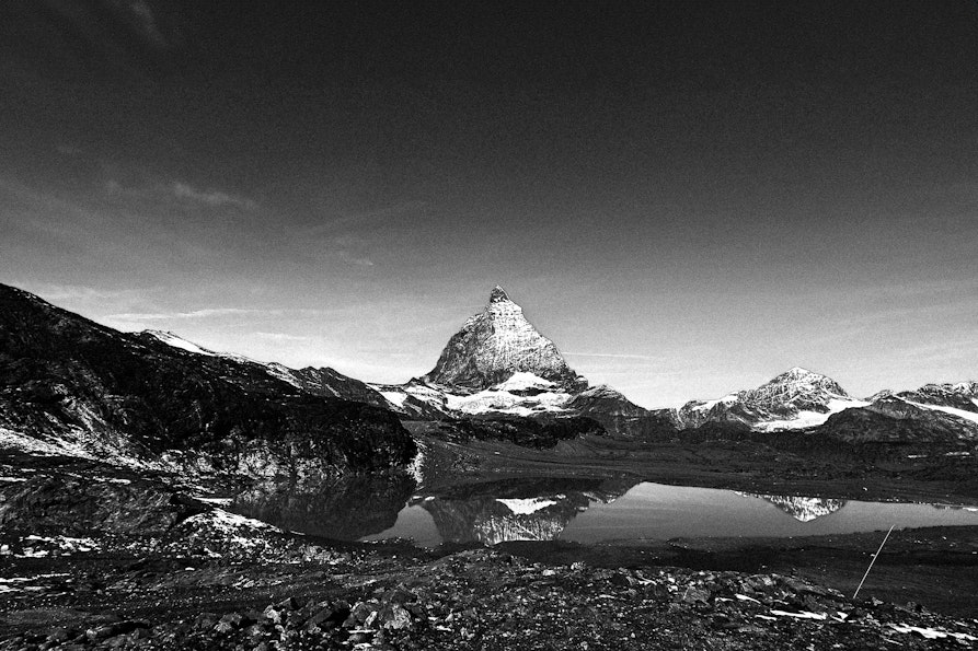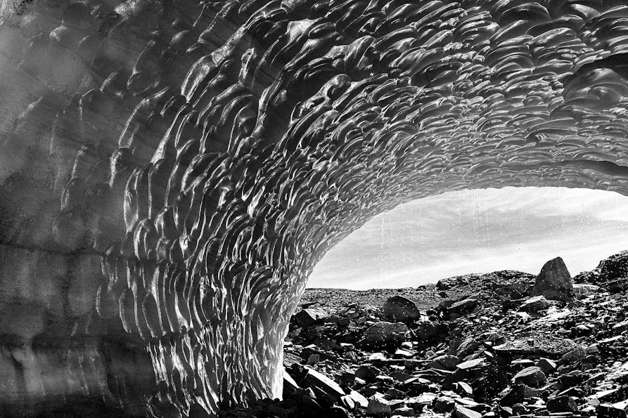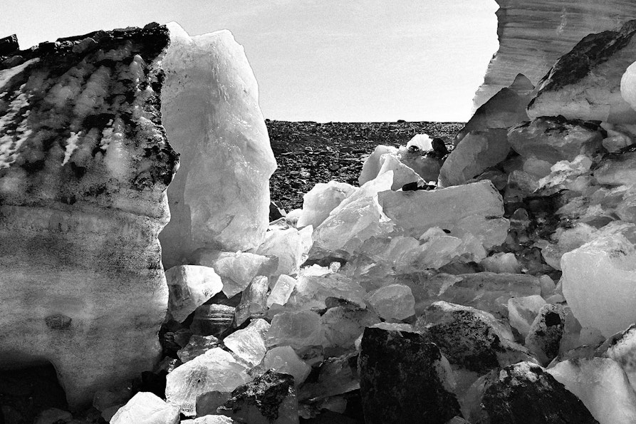 La foto di “apertura” potrebbe essere proprio il ritratto di Rino e la “chiusura” forse, per contrasto tra gli scatti, direi un'immagine del ghiacciaio. Rino è una statua, un bronzo di Riace, anche solo per il colore della pelle: di sfondo, nel ritratto, ha il Cervino e sembra un tessuto unico, le rocce della parete, il terreno circostante e lui hanno la stessa texture. Mi piace tantissimo il cappellino nero con la scritta in giallo fluorescente, ma soprattutto la pelle, ne ho colto il dettaglio: cotta dal sole, da ore e ore all'aria aperta. E poi gli occhi felici, lo sguardo fiero, senza rimpianti. Mentre gli scatti al ghiacciaio sono duri: catturano un paesaggio meraviglioso, il letto del ghiacciaio, che sembra un paesaggio lunare. È un bianco e nero molto contrastato che lascia spazio a riflessioni.