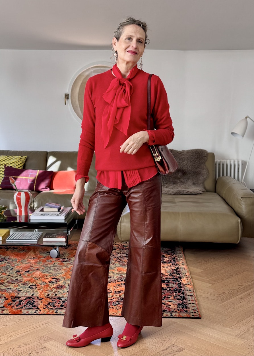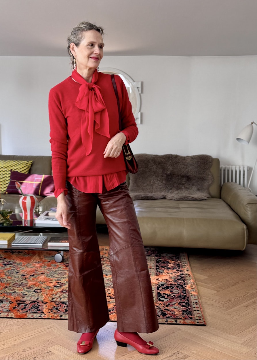 „Rot beeinflusst uns körperlich. Die Farbe hat nichts Schüchternes oder Zurückhaltendes an sich. Rot ist ideal für alles, was auffallen soll, und das gilt auch für Menschen.“ (Karen Haller) Lederhose, Aigner-Tasche und Ferragamo-Pumps sind secondhand, Max-Mara-Seidenbluse und Kaschmir-Pulli of many years. Monochrome Outfits können schnell flach wirken, daher am besten auf unterschiedliche Materialien/Texturen achten.