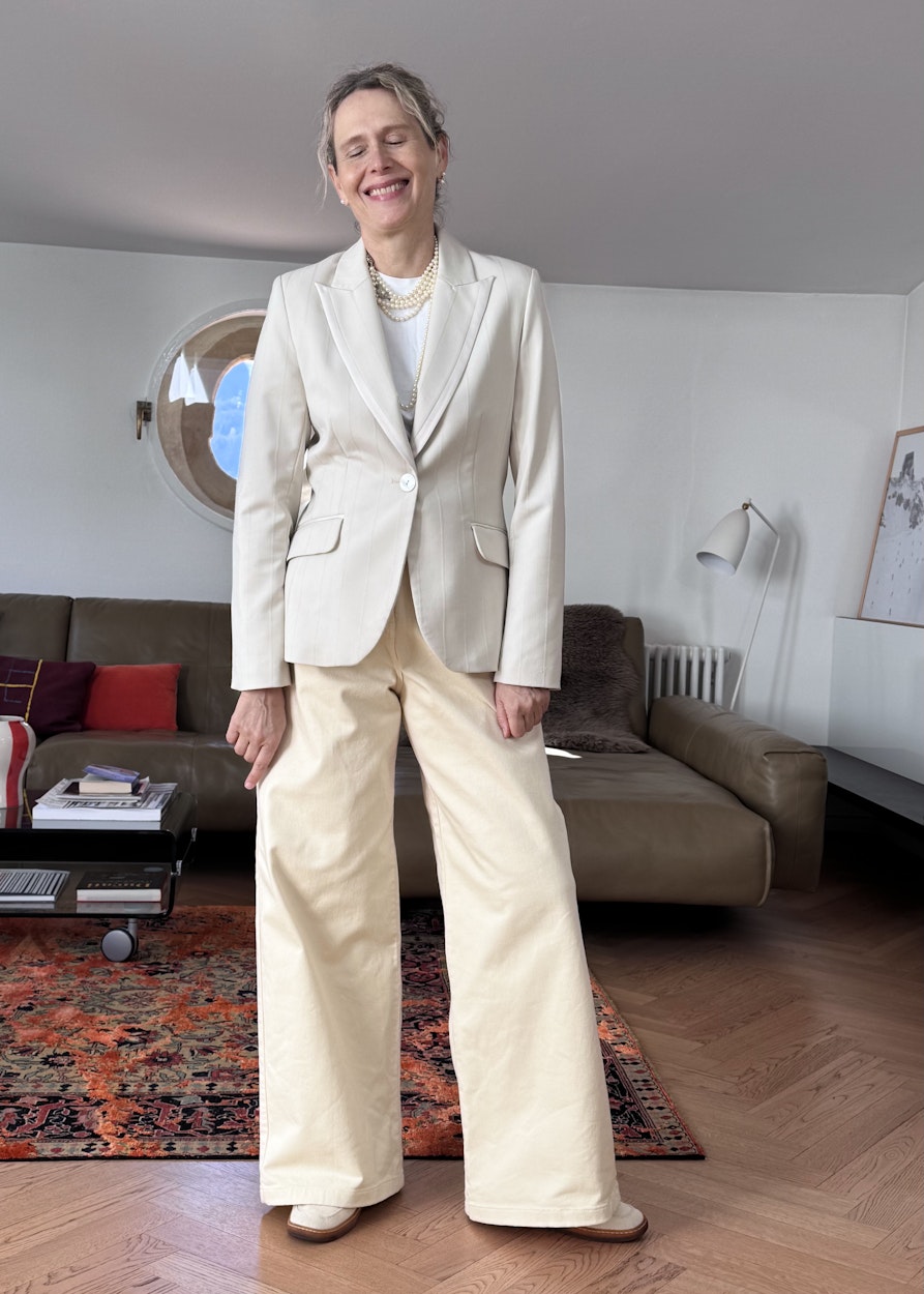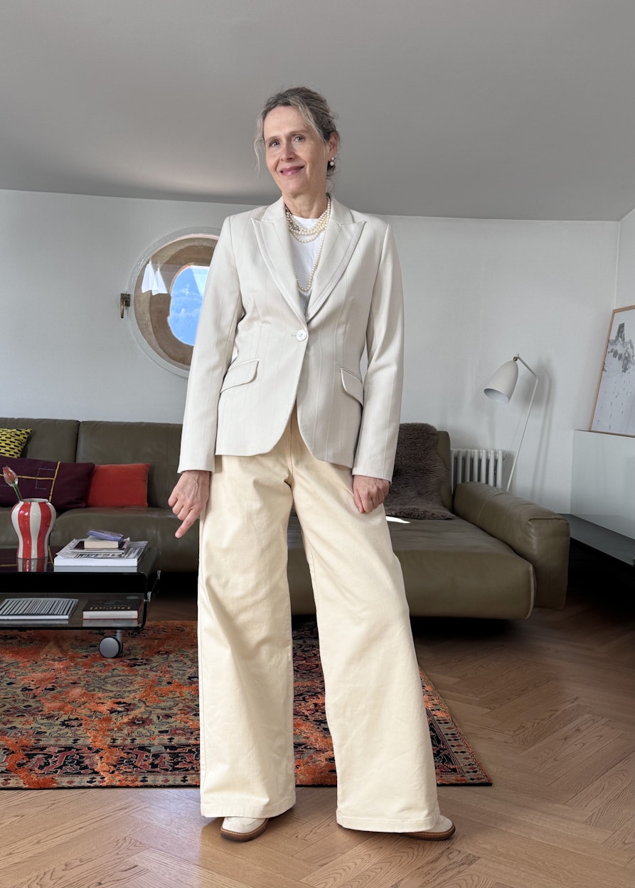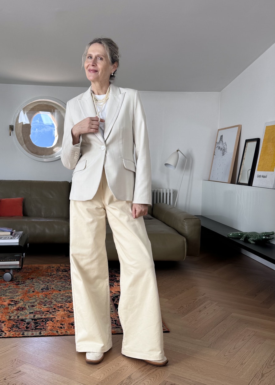 „Weiß ist Perfektion. Es ist rein und makellos und vermittelt ein Gefühl von Ruhe und Stille, Einfachheit und Klarheit. Weiß kann einen ungeordneten Geist klären und emotionale Sicherheit vermitteln.“ (Karen Haller) Hose secondhand, upgecycelter Blazer, Perlenketten von meinen verstorbenen Großmüttern, Sneakers Everlane.