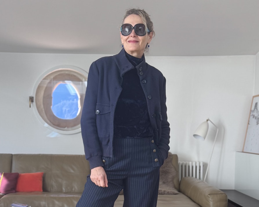 „Blau ist die Farbe des Himmels und des Meeres. Untersuchungen zeigen, dass Blau die beliebteste Farbe der Welt ist. Einige ihrer positiven mentalen Eigenschaften sind Logik und Klarheit der Gedanken. Hellere Töne werden mit geistiger Ruhe, Gelassenheit und Nachdenken assoziiert.“ (Karen Haller) Nadelstreif-Hose und Rollkragen secondhand, altes Blouson, true and trusted Penny Loafers.