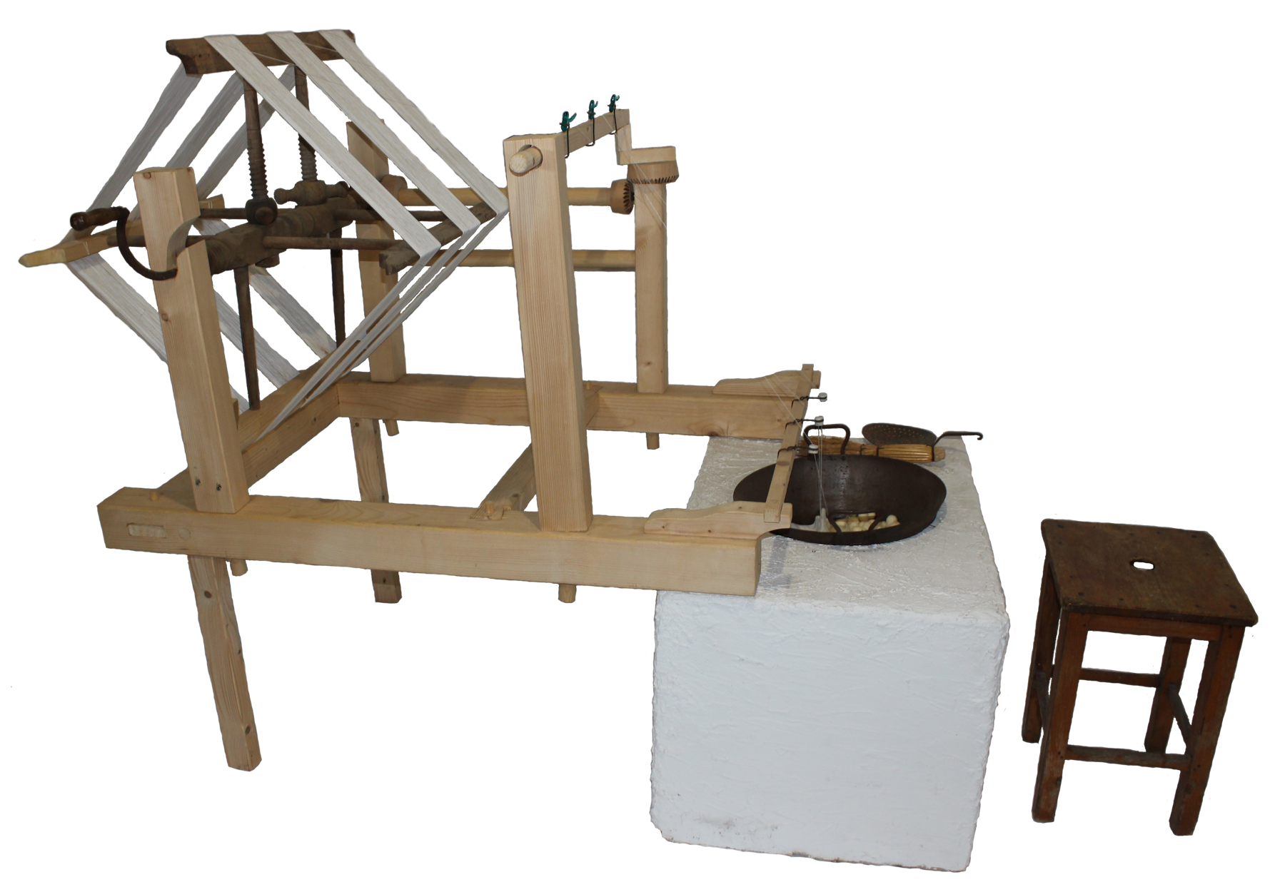 In einem Kessel wurde der Kleber der Raupe schließlich vom Kokon gelöst, der den Faden zusammenhält und anschließend zu einem verzwirnten Seidenfaden abgehaspelt. Dieser arbeitsintensive Prozess wurde bald von Seidenhaspelmaschinen unterstützt, die meist von Frauen bedient wurden.