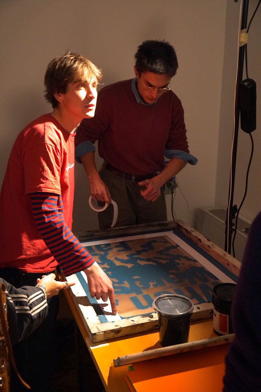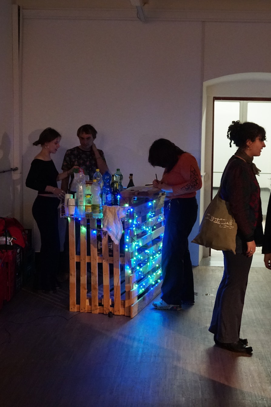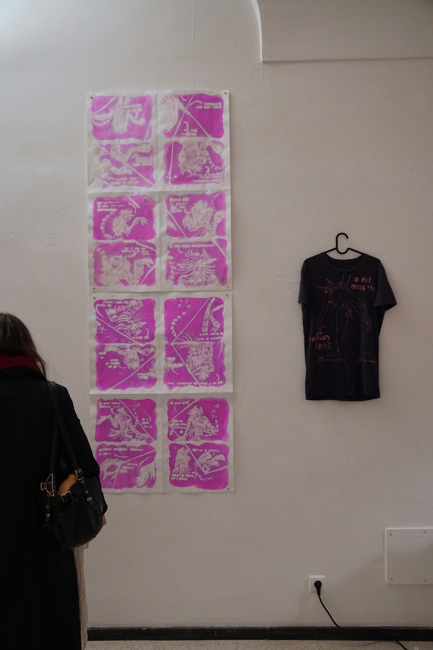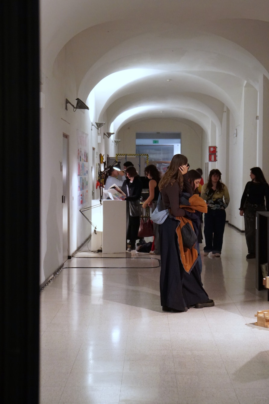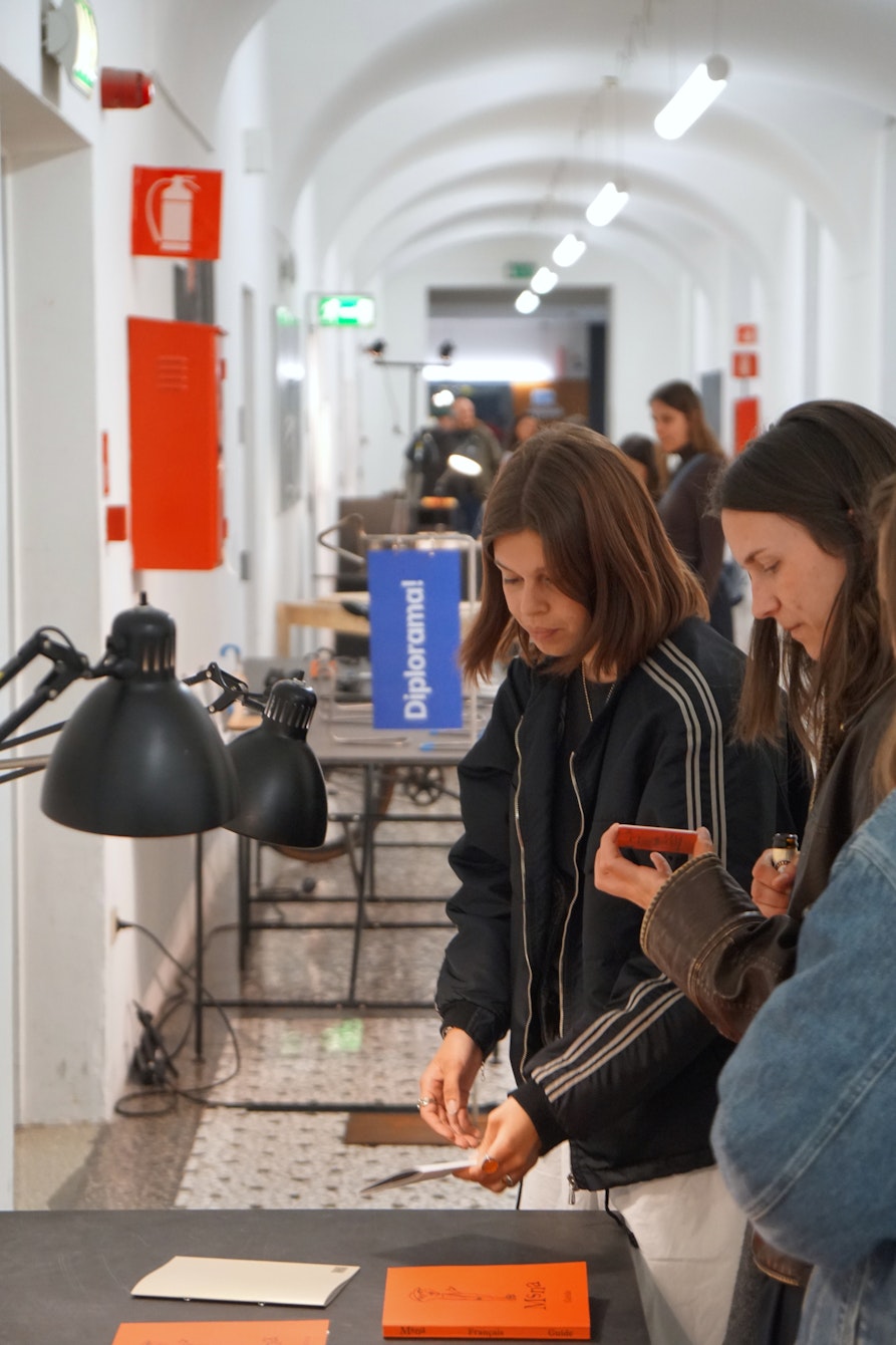 Kaum in die Ausstellung gelangt, begrüßte die Besucher:innen bereits die erste offene Tür – und zwar mit einem Raum, bespielt von den Sounds von DJ Yasmin, den Drinks der Studi-Vereinigung Lampele und der Screen-Printing-Session des ViaDante Collective, die das diesjährige Diplorama-Design zum DIY-Posterdruck freigaben. Wer hier noch eingeschüchtert von der Fülle des bevorstehenden Ausstellungsangebots war, konnte sich in ausgelassener Laurea-Stimmung erstmal einfühlen.