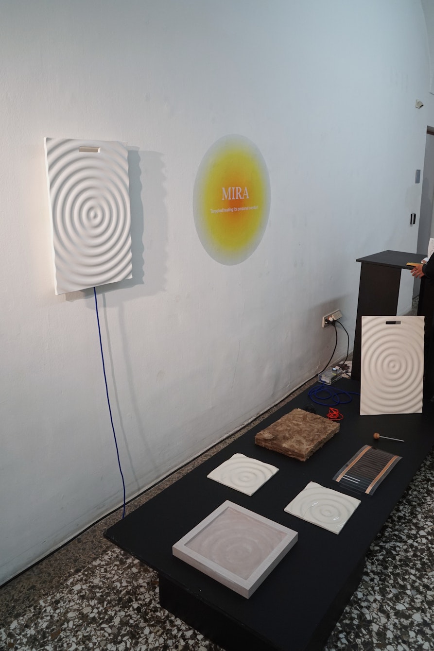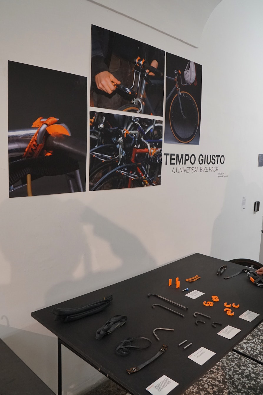 Mit Tempo Giusto präsentierte Emanuele Signorini ein Produktdesign für einen universell anwendbaren Fahrradträger. Der Prozess zum modularen Aufbau war neben dem Ausstellungsexemplar zu sehen. Ein paar Schritte weiter: Mira, ein innovatives Heizungskonzept mit Keramikplatten als Heizelement, entwickelt von Allegra D'Achille.