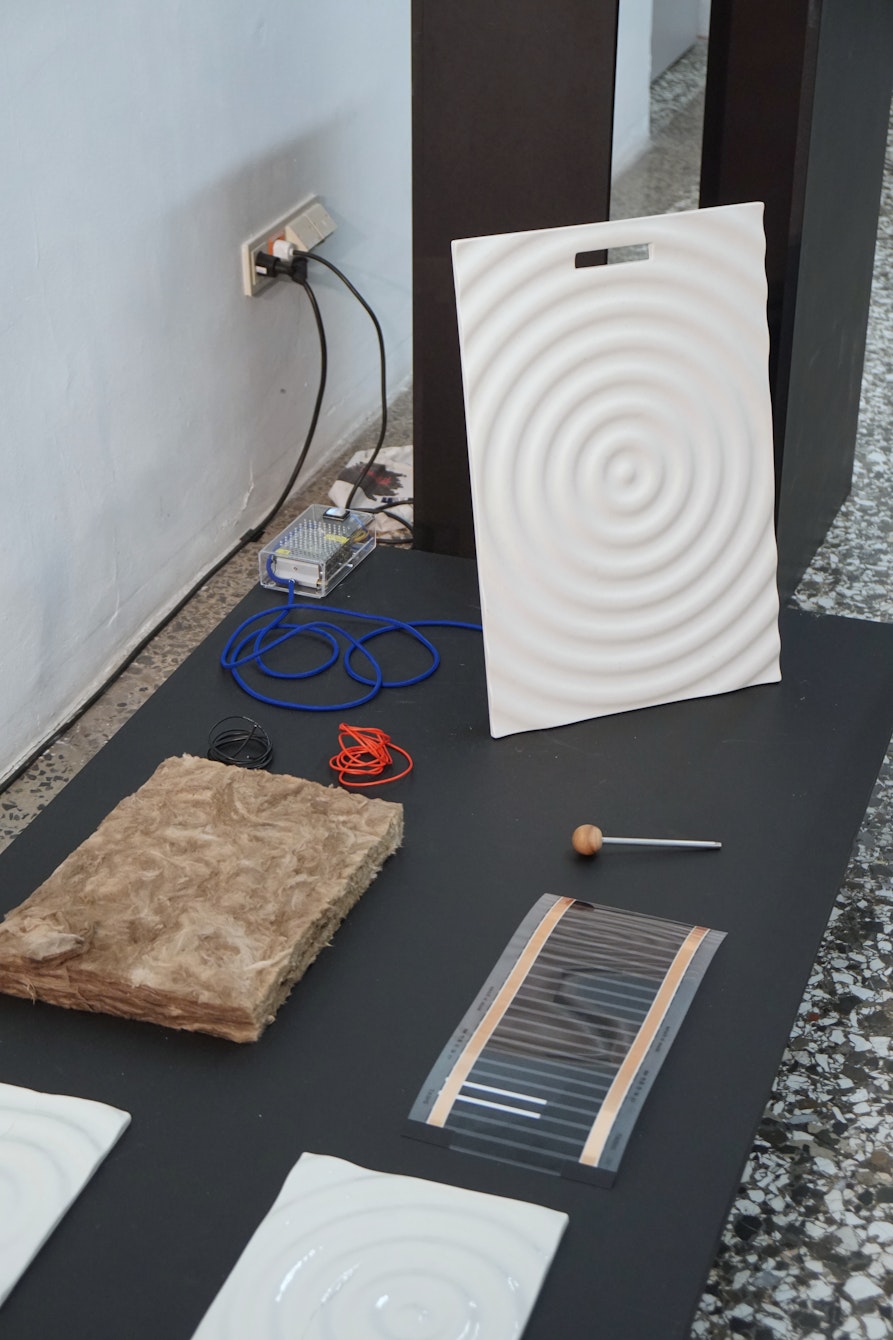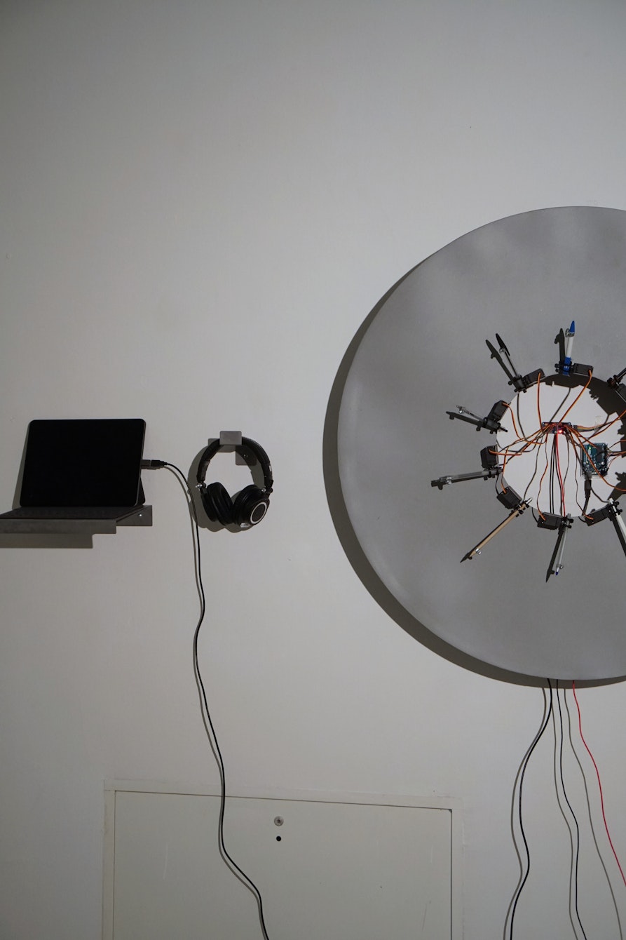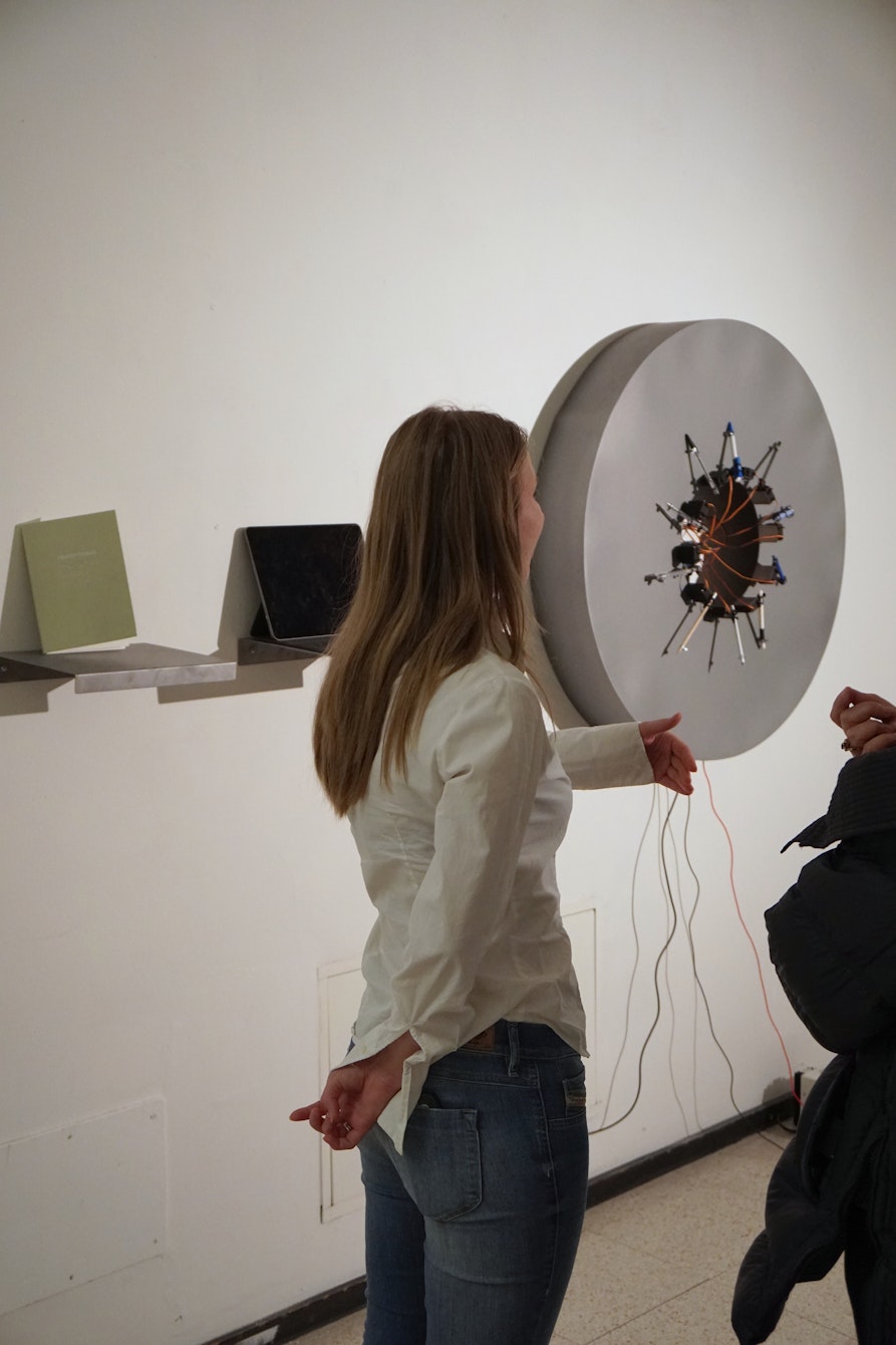 Perceptional trifft den Titel der Ausstellung besonders gut. In ihrem Daten-Verklanglichungs-Projekt nahm Ingrid Meszaros die biometrischen Daten der Herzfrequenz und der Herzfrequenzvariabilität von Studierenden in der Prüfungsphase auf, um diese mit physischen, mechanischen Mitteln in Ton umzuwandeln. Das Ergebnis ist eine Installation aus den Stiften der Studierenden, die auf eine Eisenplatte mit Resonanzkörper schlagen und den Ausstellungsraum mit dem studentischen Rhythmus aus Stress, Paaause und Anspannung bespielen.