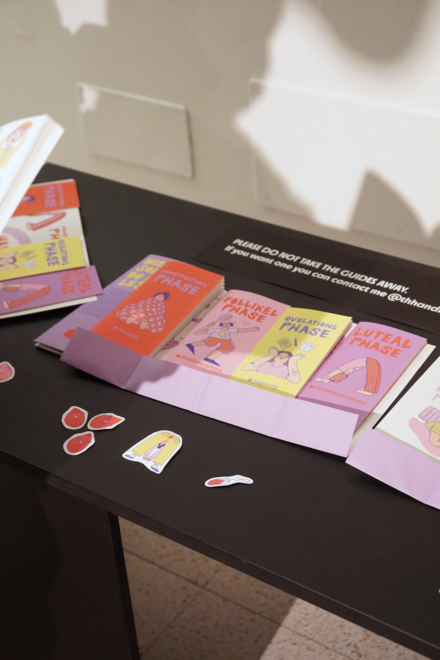 Tabus brechen, um zu informieren und einen natürlichen Rhythmus zu entstigmatisieren und illustrativ über ihn zu informieren – gleichermaßen für Menschen, die mit und die ohne Menstruationszyklus leben. Genau das möchte Theresa Handig mit Hallo, Ich* Menstruiere bewirken. Ihre Illustrationen bieten in Brochüren, die den einzelnen Phasen des Menstruationszyklus gewidmet sind, einen anschaulichen Zugang zum Thema und verleihen dem Ausstellungsraum den selben Effekt.