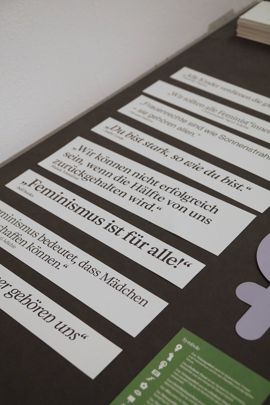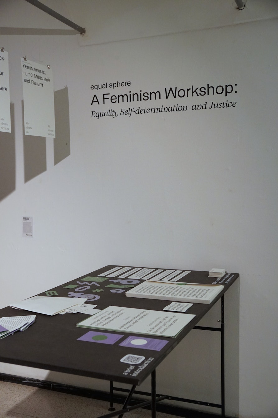 Gleich daneben verfolgt Hannah Dusch mit ihrem Projekt Equal Sphere: Feminism Workshop einen ähnlichen Ansatz ... mit einer ähnlichen Mission. Auch hier sollen aus der Recherche gewonnene Inhalte und Informationen an eine junge Zielgruppe visuell kommuniziert werden. In diesem Fall: Feministische Ideen, Bewegungen, Ideale und Werte, die in digitalen Medien heute oft nur oberflächlich dargestellt werden.