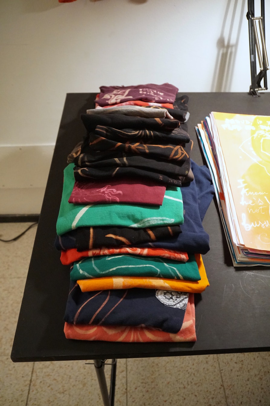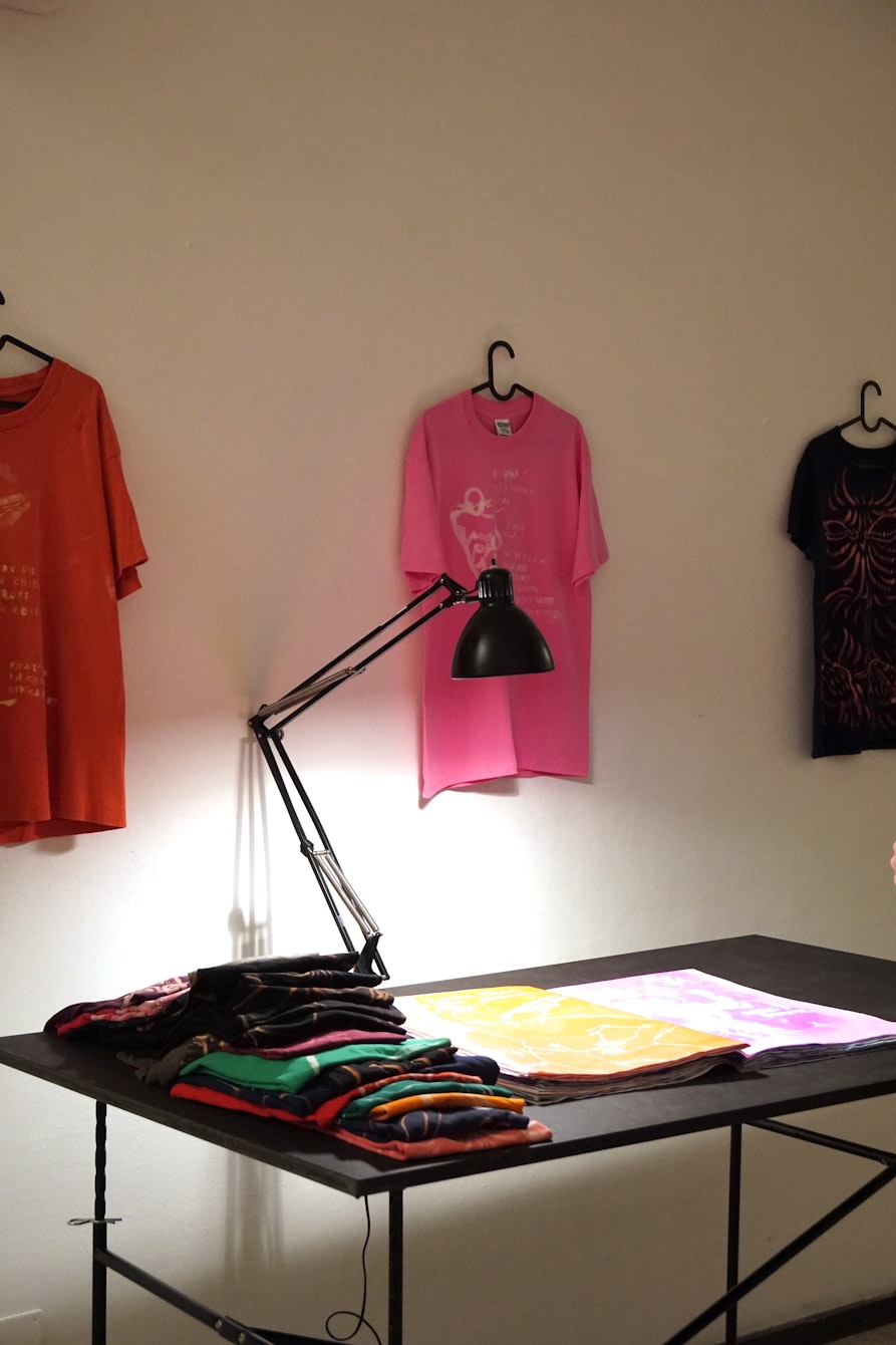 Neben all den Design-Projekten vergisst man schnell mal, dass an derselben Fakultät auch junge Künstler:innen abschließen. Eine davon ist Ludovica Faro, die in verschiedene Städte in Europa gereist ist, um ausgestattet mit Bleichmittel und Baumwoll-T-Shirts an einem partizipatorisch performativen Kunstwerk namens Bleaching Point zu arbeiten. Die urbanen Umgebungen dienten als Bühne für Interaktionen mit Fremden, die wiederum Zitate produzierten, welche auf den ausgestellten T-Shirts zu sehen sind.