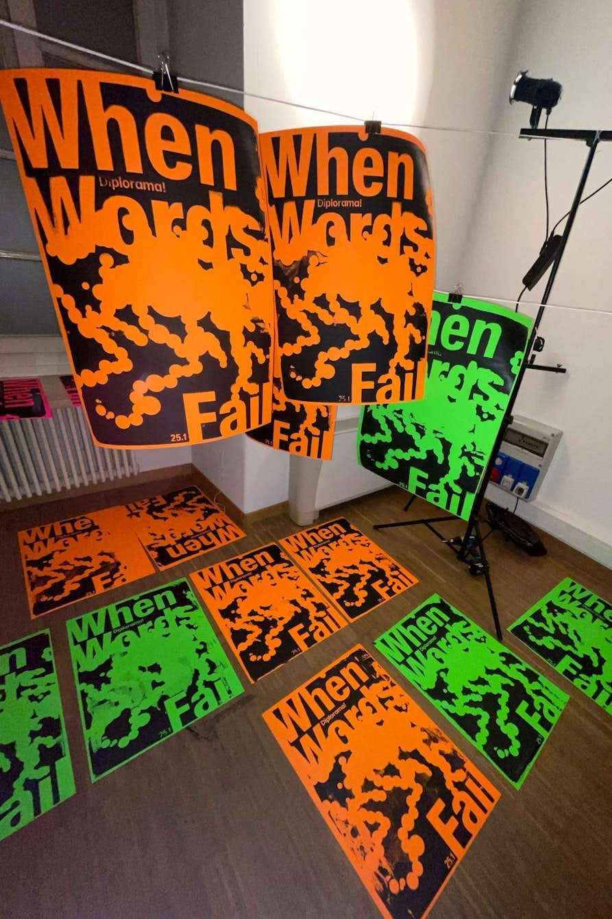 When Words Fail – Wenn Worte fehlen als diesjähriges Ausstellungskonzept beschäftigt sich mit den Herausforderungen, Dinge mit Worten zu beschreiben, und zeigt die kreativen Lösungen, die aufstrebende Künstler:innen und Designer:innen dafür finden. Die Spannung der semantischen Lücke, die die Diskrepanz zwischen dem, was sich Menschen vorstellen können, und dem, was eine Maschine tatsächlich reproduzieren kann, versuchte das erste Ausstellungsprojekt bereits zu lösen: Ines Brandt lieferte mit Ich hure ein innovatives und bedeutsames Recherche- und Ausstellungskonzept, das der Repräsentation von Sexarbeit in Medien und Popkultur gewidmet war.