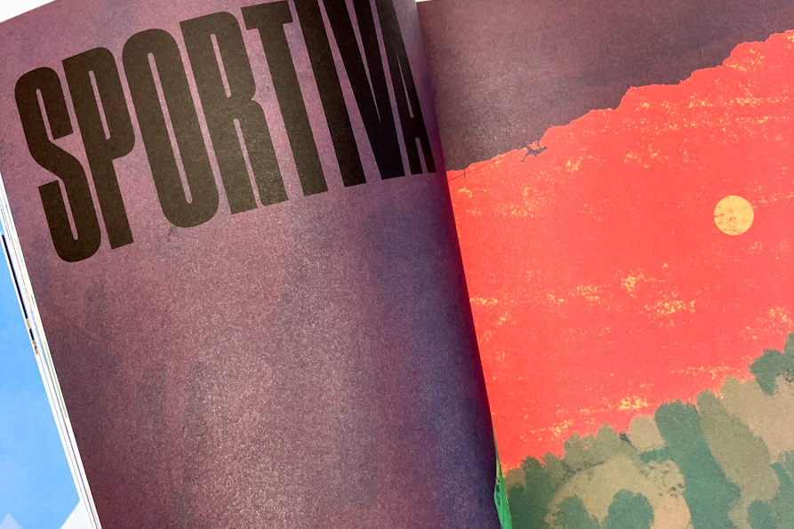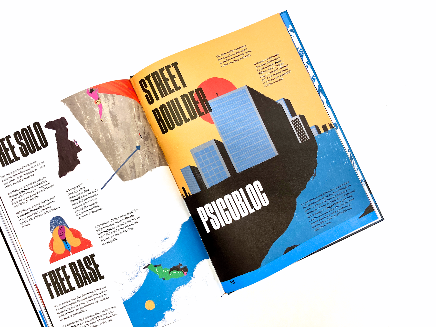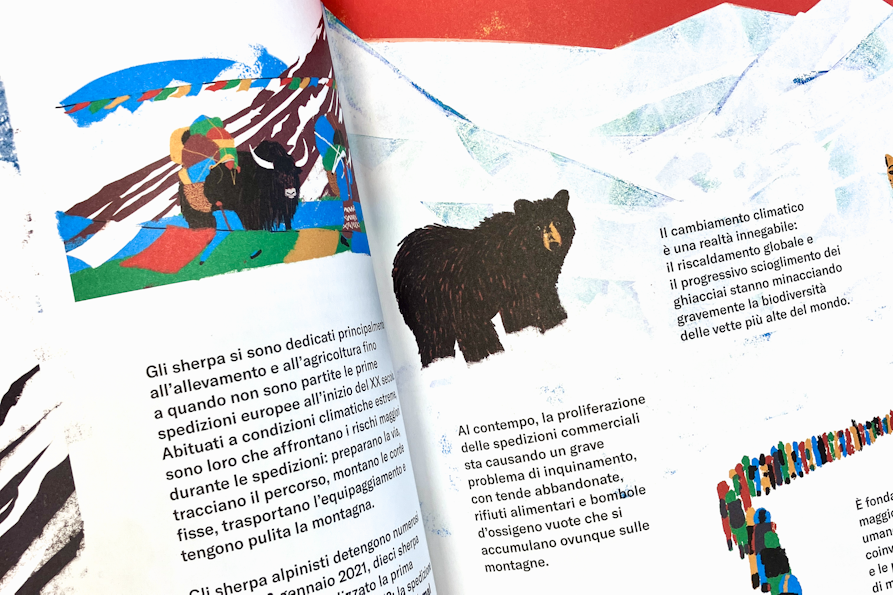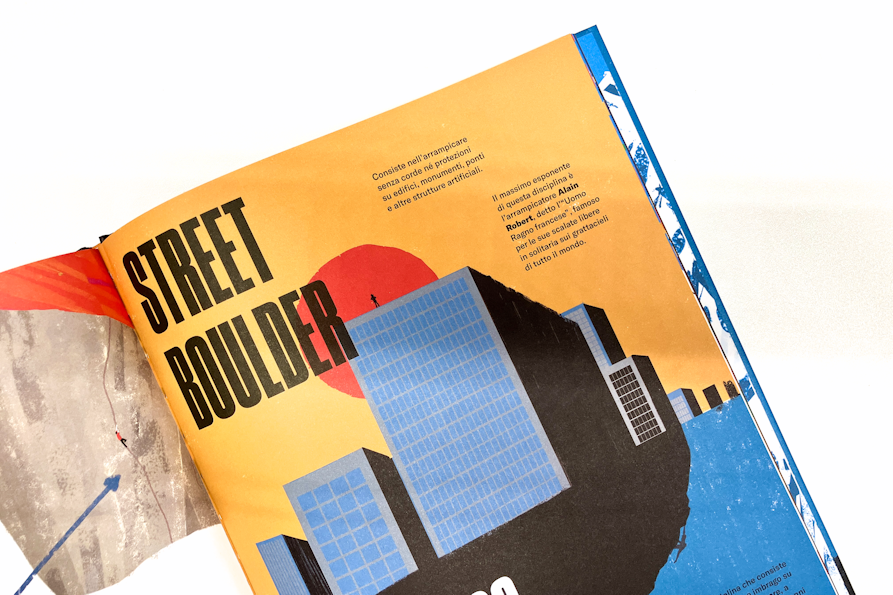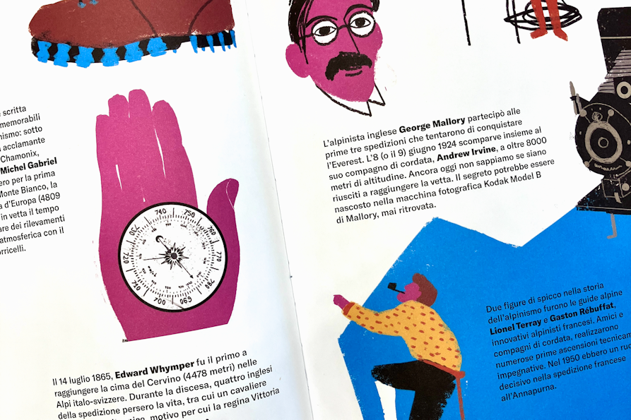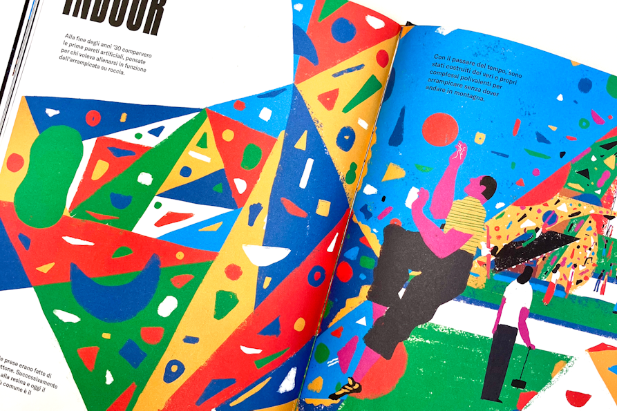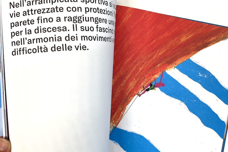 Aprendo Verticale – Storia illustrata dell’arrampicata, ci troviamo subito catapultati nell’habitat naturale dell’arrampicata: eccola lì la grande montagna che campeggia seconda e terza di copertina. Le illustrazioni di Ximò Abadía sono le assolute protagoniste del libro e pagina dopo pagina, si ha l’impressione che il layout del testo sia costruito proprio attorno ad esse e non viceversa. I testi sono sempre allineati bandiera a sinistra e utilizzano un font sans serif bello pulito e funzionale, in netto contrasto con il font condensed bold utilizzato in copertina e che ritorna anche all’interno per i titoli. Graficamente i quattro macrocapitoli si aprono tutti con un illustrazione che occupa due pagine e in cui il titolo rimane ancorato in alto a sinistra; girando la pagina troviamo sulla sinistra un testo che introduce alla disciplina, con una tipografica minimale e che si staglia sulla pagina bianca in contrapposizione con la colorata illustrazione che occupa invece la pagina di destra. Nei capitoli di approfondimento non ci sono più vere cover page e questo aiuta a comprendere non solo la gerarchia del libro, ma anche a dare ritmo alla lettura. Verticale – Storia illustrata dell’arrampicata vuole essere graficamente un libro senza fronzoli, che va dritto al punto (o alla cima) e in cui testo e illustrazioni hanno uguale importanza ed interagiscono costantemente. In questo senso, si capisce che è un libro concepito dall’illustratore stesso, o almeno così credo io.