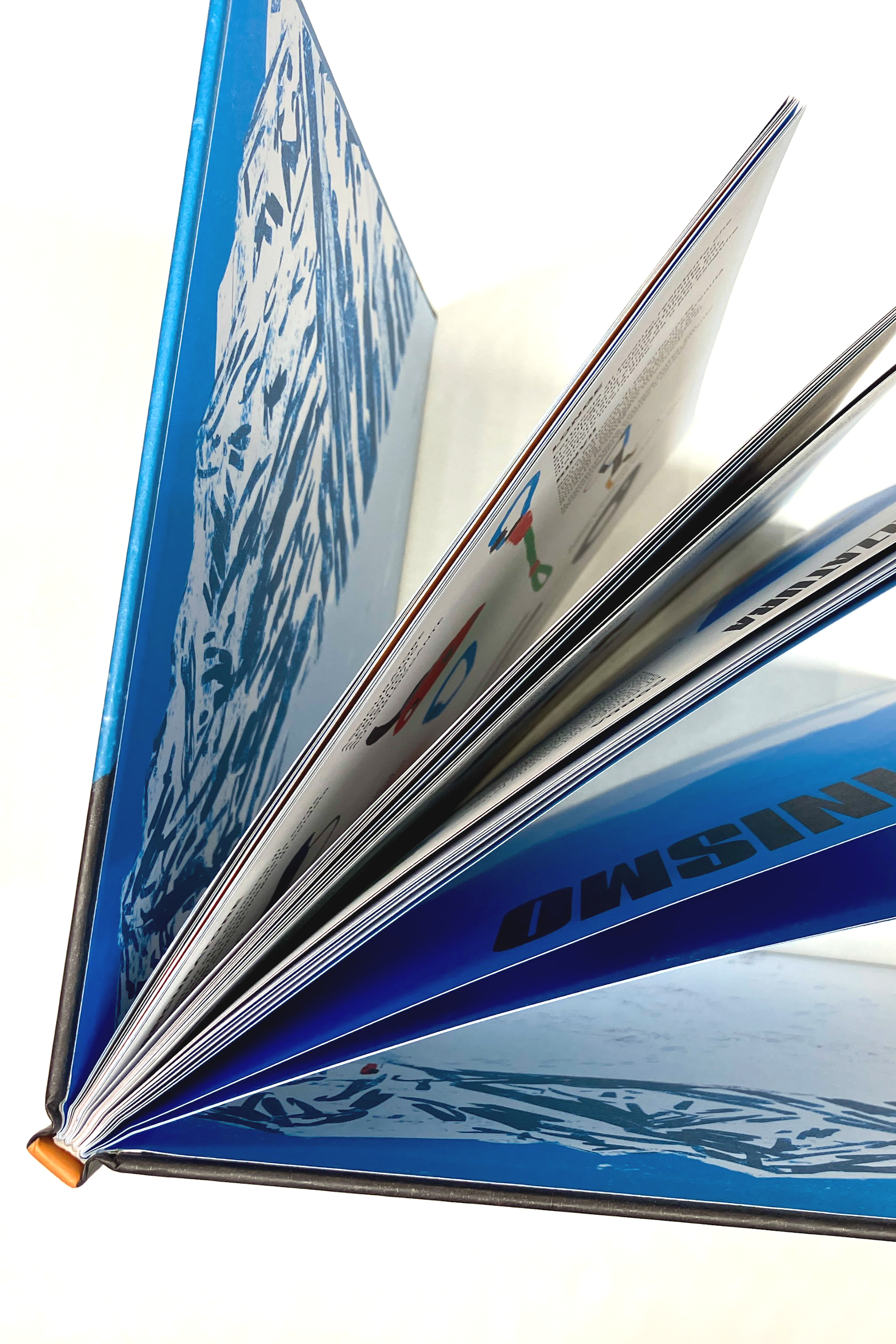 Con la sua copertina rigida cartonata di 32x24,5 cm e poco più di un centimetro di dorso, Verticale – Storia illustrata dell’arrampicata è un ancora una volta un bel librone che non passa di certo inosservato. La copertina è un paesaggio illustrato che continua sul retro e impiega solamente tre colori: il nero, il blu crepuscolo e l’arancione. La tipografia gioca furbescamente sulla parola che da anche il titolo al libro: VER-TIC-ALE: così sillabato e con un font condesed bold, il titolo forma proprio un blocchetto di testo verticale -per l’appunto- e con il suo arancione vivido sembra accedere la copertina buia, come la luna che si nasconde dietro il bosco illustrato poco sotto. A prima vista non lo si vede subito, ma eccolo lì: c’è un arrampicatore aggrappato alla roccia scura che taglia diagonalmente la copertina. Il dorso arancione con il titolo scritto naturalmente in verticale, rende il libro subito riconoscibile in una libreria e anche i blocchi di testo sul retro risultano particolarmente slanciati.