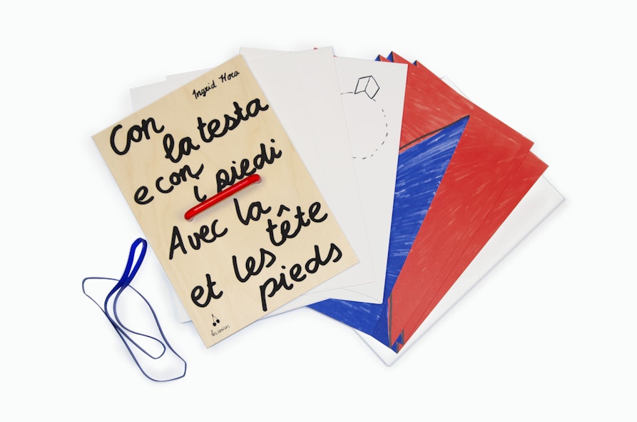 Sì anche in quel caso abbiamo scompaginato il formato-libro. Il libro realizzato con Ingrid Hora nel 2019, dal titolo Con la testa con i piedi è in formato scomponibile. Lo si può aprire e usare per giocare, per creare dei fortini, dei percorsi ed azioni. Ingrid è un’artista che usa spesso la performance e la collaborazione nella sua ricerca artistica. Proprio adesso stiamo lavorando ad un secondo progetto con lei, perché ci sembra bello, a volte, lavorare con le stesse persone per sviluppare nuovi progetti. Il libro in lavorazione con Ingrid nasce da una serie di spunti sviluppati in dei laboratori per bambini sull’idea poetica di acchiappare le nuvole e la pioggia. Anche in tal caso, libro e gioco saranno due aspetti che si intrecceranno tra loro.