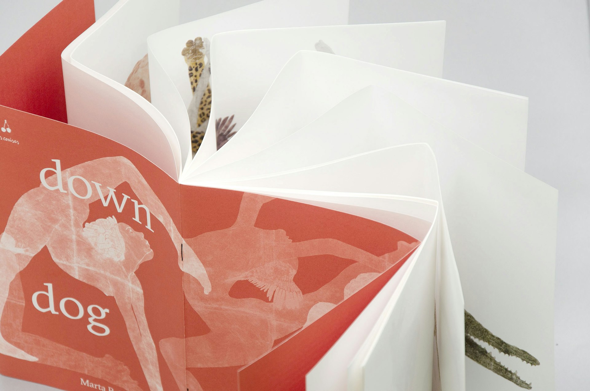 Per esempio per il libro di Chiara Camoni, che ha immaginato un telefono senza fili tra animali diversi tra loro, disegnati a china, abbiamo cercato di dare matericità al libro, con delle pagine doppiate e con una carta molto materica, perché la matrice del lavoro di Chiara è principalmente la scultura. Il suo libro si può anche aprire completamente con una spirale, facendolo diventare “altro”. Tra gli ultimi libri pubblicati c’è anche Down Dog (2024) di Marta Roberti. Ha il formato ad album con una carta leggera, ripiegata secondo una particolare modalità usata effettivamente da Marta per i suoi disegni monumentali, che poi però vengono arrotolati e ripiegati, facendosi piccini.