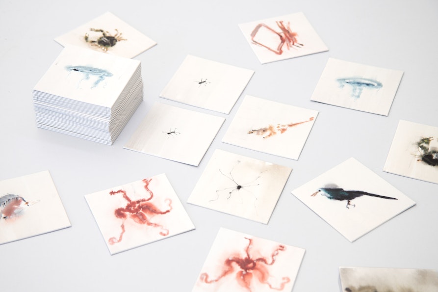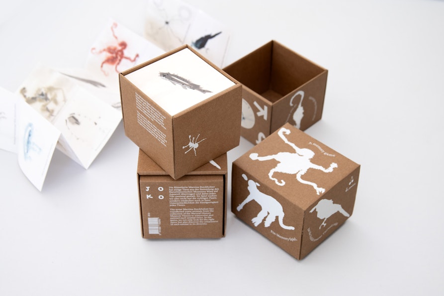 Martina ha voluto dipingere questi animali due volte, in due momenti diversi: ci sono quindi delle piccole differenze tra le coppie di immagini del memory, cosa che rende un po' più difficile il gioco nell’abbinare le tessere. Gli animali dipinti sono a rischio di estinzione e questo ci sembrava anche un modo carino per rivolgere l’attenzione ad esseri che oggi ci sono ma che, se non stiamo attenti, domani non ci saranno più. Le carte dipinte da Martina sono conservate in una scatolina serigrafata. Non c’è testo se non una piccola leggenda degli animali con il loro nome in tedesco e latino e le istruzioni del gioco.