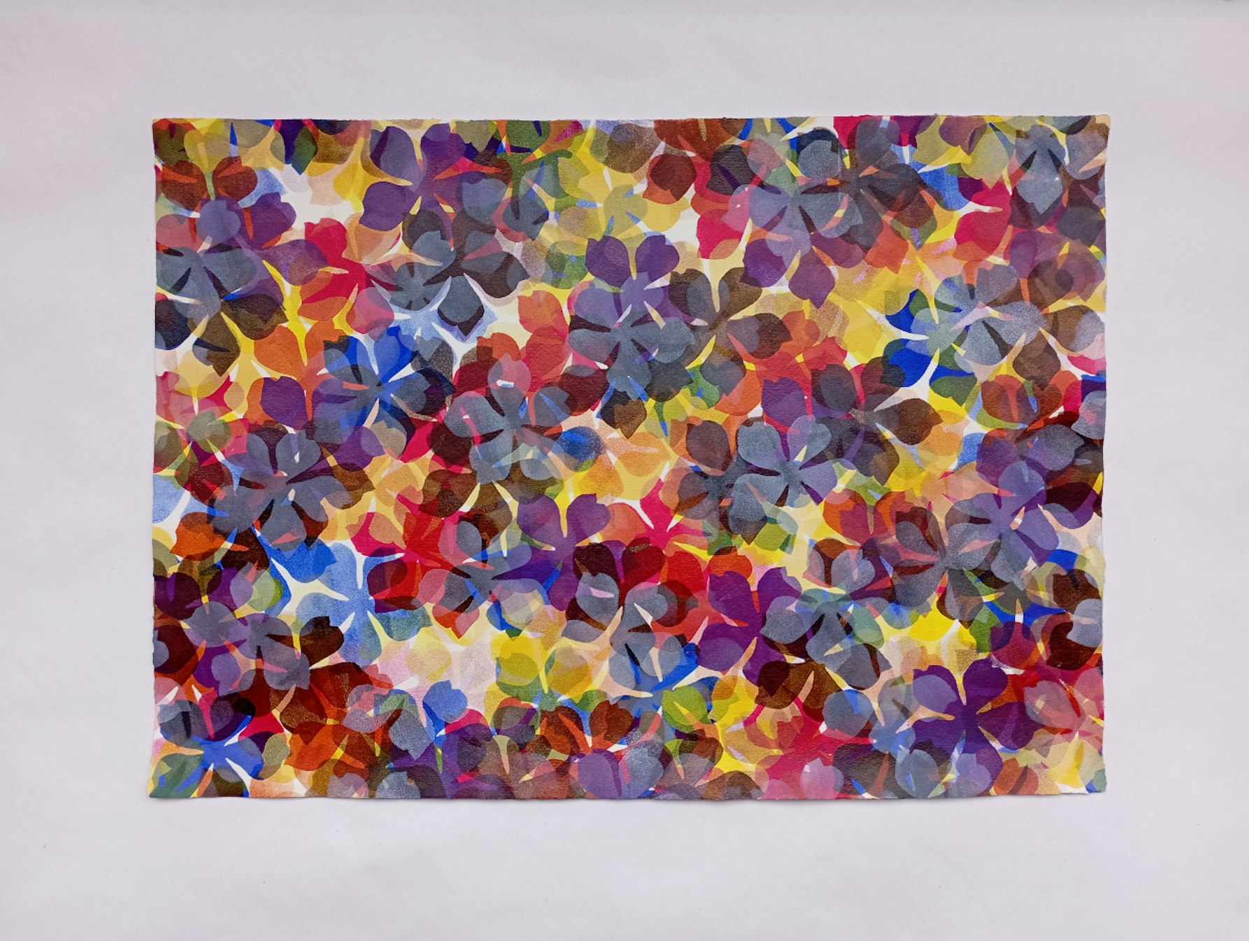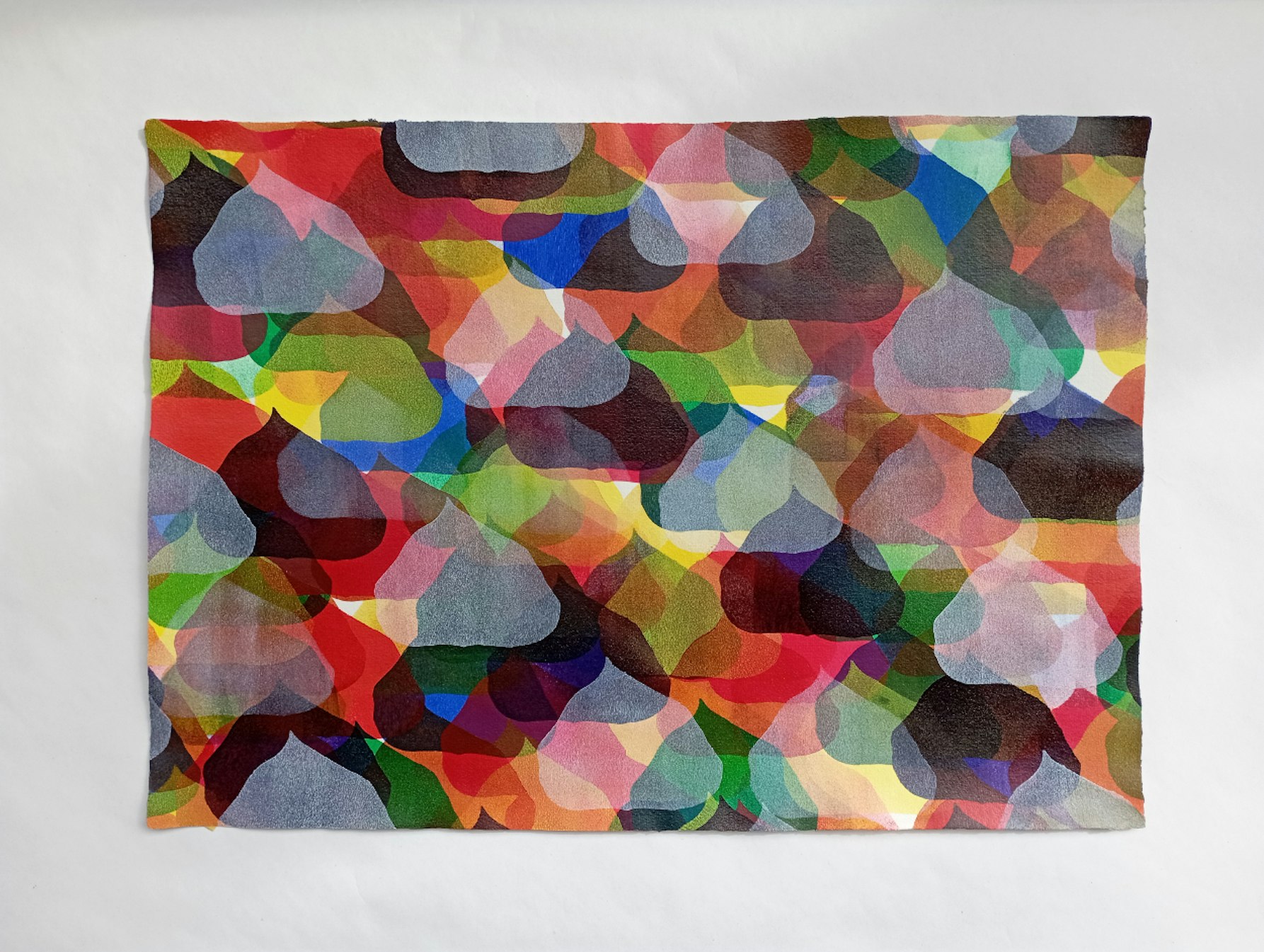 In manchen Bildern der Künstlerin lassen sich Formen erkennen: ein Herz, ein Blatt, Pflanzenmotive. Andere hingegen wirken wie ein offenes Fenster, durch das Licht hereinfällt, oder wie eine Detailansicht aus einem geflochtenen Stoff. Diese Gittermuster scheinen einen eigenen Rhythmus zu haben, vielleicht sogar eigene Gesetzmäßigkeiten. Die schillernden und oft durchscheinenden Farben erzählen von einer ständigen Entdeckungsreise, bei welcher der Blick über die Grenzen des Bekannten hinausschweift und neue Ausblicke schafft, die sich selbstständig weiterentwickeln. Im Gespräch erzählt Magdalena Bolego uns mehr über ihren Werdegang und ihren Schaffensprozess.