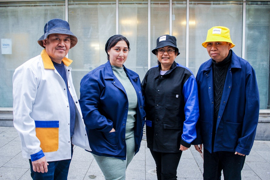 Mit ihren Workers Collabs – eine Idee, die Kim aus ihrer Abschlussarbeit an der Design Academy of Eindhoven entwickelte – setzte About A Worker diese Vision der Demokratisierung kreativer Freiheit zuerst durch inklusives Design in die Tat um. Dabei wurden jeweils Arbeiter:innen aus vier verschiedenen geographischen und professionellen Kontexten in Workshops eingearbeitet, um gemeinsam Kollektionen zu verwirklichen, inspiriert von der Arbeitskleidung, den Geschichten, den Bedürfnissen, der Kreativität der Arbeitenden und des lokalen Kontexts. Diese ersten vier Kollaborationen entstanden mit einer Textilfabrik im Pariser Vorort Saint Denis, dem Frauengefängnis Giudecca in Venedig, dem französischen Mode- und Versandhaus La Redoute in Roubaix und mit Fabrikarbeiterinnen des Industriedistrikts in Shenzhen in China.