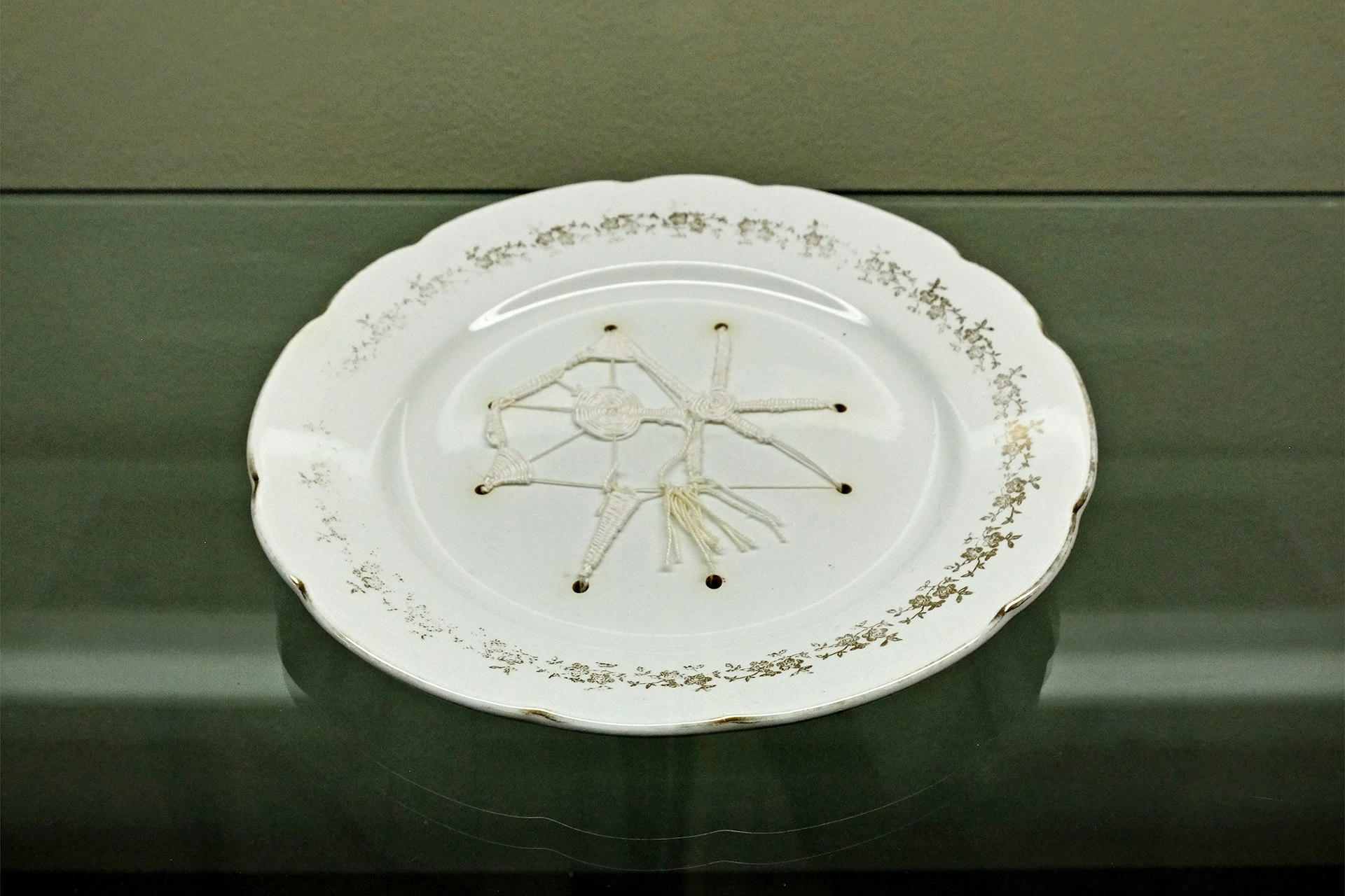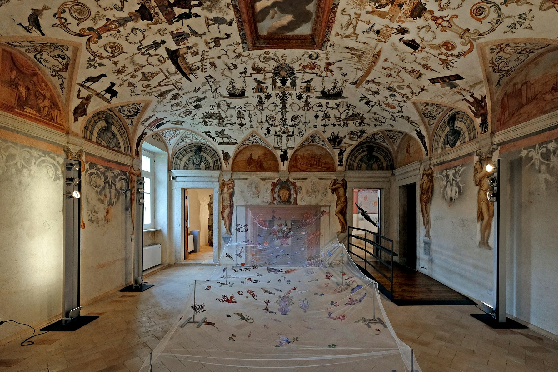 Credo che il lavoro di Federica Gottardello sia particolarmente emblematico per cogliere il senso profondo della mostra. Non solo per la qualità della sua ricerca, ma anche per il modo in cui ha saputo accogliere e restituire lo spirito del luogo. Federica si è lasciata toccare profondamente dalla Sala dei Sogni, uno spazio straordinario decorato con enigmatiche raffigurazioni seicentesche: scene che mescolano elementi orientali, mitologici, simboli di guerra e visioni oniriche. Queste immagini sono state per lei una fonte di ispirazione potente. Le ha rielaborate in una sorta di controvolta eterea, sospesa e trasparente, trasformandole attraverso un lento lavoro manuale: ago e filo su carta. Con pazienza meditativa, ha ricamato quelle visioni ridonando loro nuova vita, trasfigurandole in figure animali e vegetali dal tono poetico, delicato, quasi sognante. Come accennato poc’anzi, poesia che accompagna il suo lavoro è di Chandra Livia Candiani e invita a farsi “sentinelle vegetali”: un’immagine che attraversa l’intera installazione e che ben sintetizza lo spirito della mostra. Il gesto lento, attento, ripetuto di Federica è stato anche un atto di ascolto, un modo per stare nel tempo lungo dell’attesa e dell’invisibile. È proprio da qui che nasce quella tensione tra materia e sogno, tra ricordo e possibilità, che abita l’intero progetto espositivo.
